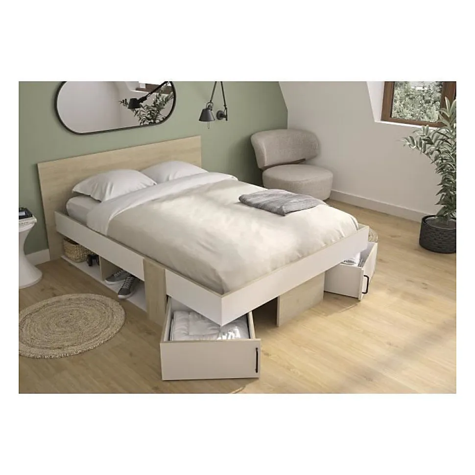 Lit adulte DIAGONE SWIVEL 140 x 190 cm alliant design contemporain et rangement : 2 tiroirs pivotants, 2 casiers latéraux et 2 étagères ouvertes, finition papier décor chêne blond et blanc. Sommier et matelas non inclus. Fabriqué en France, certification Origine France Garantie FCBA1607100, garantie pièces 2 ans.