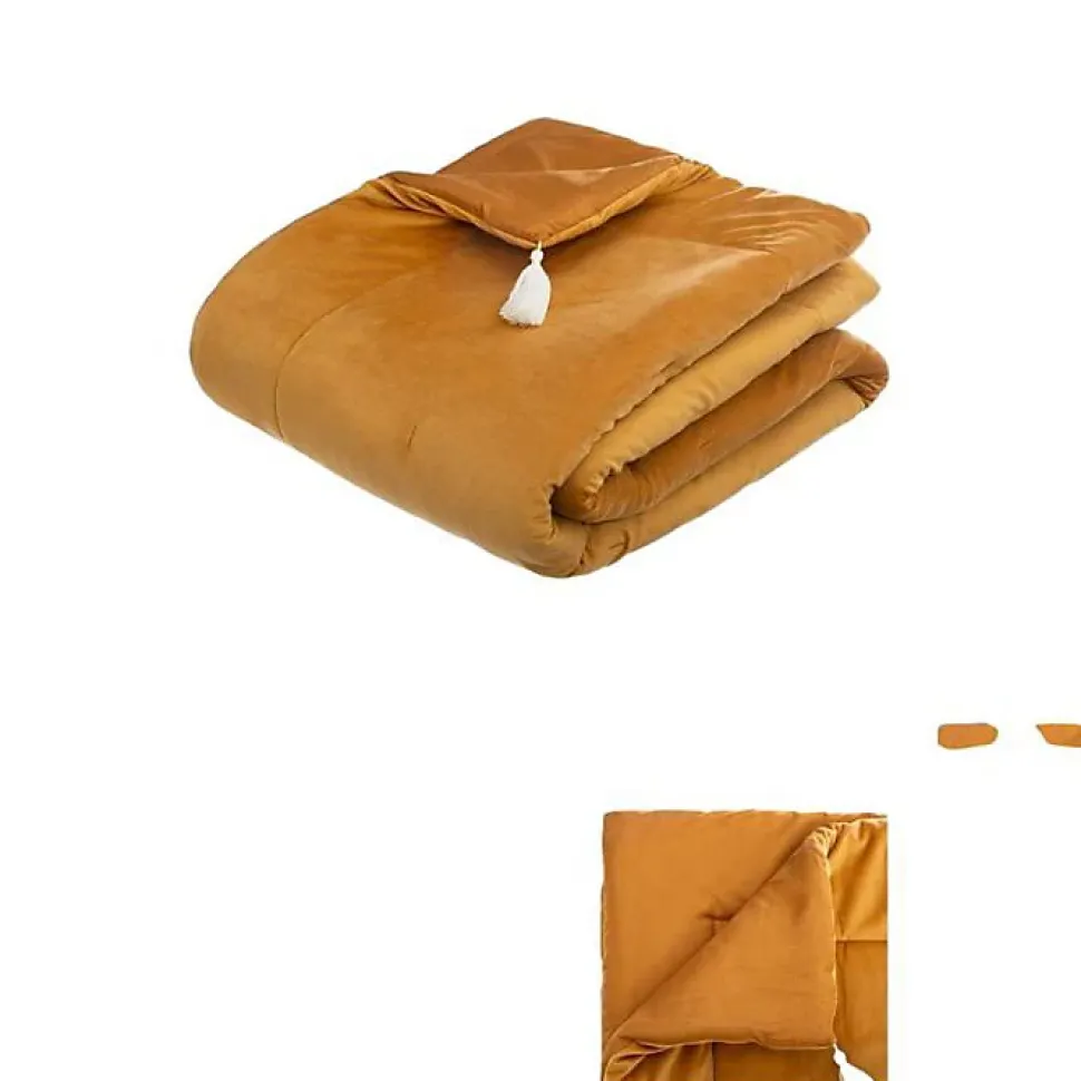 Edredon en velours Sonia 80 x 180 cm Atmosphera — dessus en velours de polyester, garnissage polyester 150 g/m². Chemin de lit doux et soyeux, lavable en machine jusqu’à 40°C, coloris ocre/jaune, poids 0,6 kg.