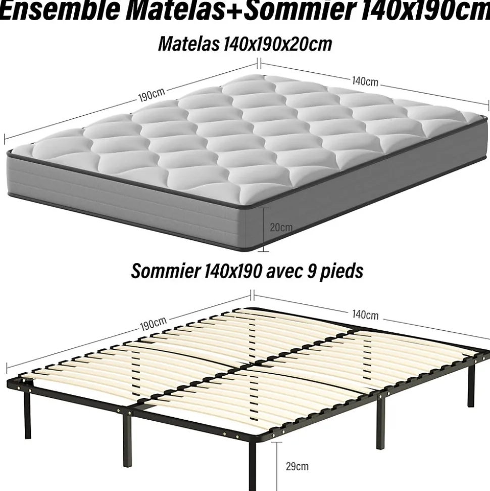 Dimensions du matelas et du cadre de lit:140x190cm. Epaisseur du Matelas 20cm7 zones de confort : Grâce à la structure 7 zones, notre matelas offre un meilleur maintien. Il s’adapte à la forme du corps et répartit la pression uniformément, assurant une sensation de confort dans n’importe quelle position de sommeil.Facile d’entretien et respirante : la housse tricotée est plus agréable au toucher, permet au matelas de respirer, dissipe la chaleur et absorbe l’humidité. Anti-acariens, antibactérien, résistant aux moisissures, hypoallergénique. Le matelas est facile à entretenir.Certifié et certifié par Certipur-US. Dimensions : 140 x 190 cm. Le matelas est livré roulé et compressé pour faciliter la livraison. Attendez 48 à 72 heures pour retrouver sa forme originale.Matériau du cadre : lattes de peuplier de 7 pieds (environ 29 cm), 36 lattes au total.Fermeté du matelas : moyennement soupleMatériau de rembourrage : ressortsHypoallergénique : OuiHauteur (cm) : 20Housse amovible : nonDouble face (été/hiver) : ouiDimensions du matelas déplié : 140x190x20cmLongueur de l’enveloppe du matelas : 144cmTaille de l’emballage du matelas : 30cmTaille de l’emballage du matelas : 30cmPoids du paquet de matelas : 28.7kgVeuillez noter qu’il existe une erreur de 1 à 2 cm dans la mesure manuelle, ce qui est normal.Avis:1.Veuillez prévoir 48 à 72 heures pour que le matelas reprenne sa forme d’origine.2.En raison de la grande taille du colis, nous l’envoyons séparément, il peut y avoir un écart dans l’heure d’arrivée, si vous avez des questions, veuillez nous contacter.3. Livré en kit en un seul carton & livré avec notice de montage.