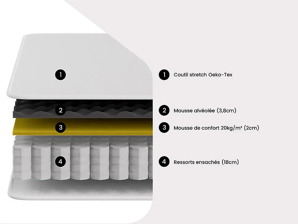 - Surmatelas intégré, Mousse alvéolée et ressorts ensachés, Coutil stretch