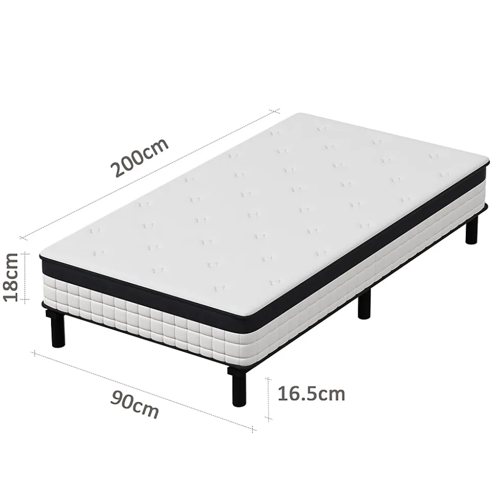 Description du produit:Epaisseur du matelas : 18cmHauteur des pieds en plastique : 16,5 cmNombre de pieds en plastique : 6Structure : ① tissu tricoté : 1cm de mousse matelassée ; 1cm de mousse matelassée bleue ; ② tissu couleur naturelle : 1cm de mousse haute densité ; ③ feutre de coton : 15cm de ressorts ensachés de 1,9mm ; ④ feutre de coton : non-tissé rigide bord inférieur : tissu (noir 3D + blanc tricoté) 0,8cm de mousse matelassée.Matériau des lattes : fer1. taille : matelas à ressorts 90x200x18CM, avec cadre de lit en fer robuste 90x200CM, avec pieds, lattes et vis. 2. stabilité et durabilité : le dos du matelas est incrusté de planches de bois soutenues par 6 pieds robustes en plastique naturel avec patins antidérapants ;2. stabilité et durabilité : le matelas est incrusté de planches de bois robustes à l’arrière, soutenu par 6 pieds robustes en plastique naturel avec des patins antidérapants, et des traverses métalliques des deux côtés renforcent la stabilité et la sécurité du lit ; la hauteur du cadre de lit par rapport au sol est de 16,5 cm, ce qui peut être utilisé comme espace de rangement pour faciliter le nettoyage et permettre aux aspirateurs robotisés de passer facilement.3. assurer un sommeil confortable : la structure à 7 zones est adoptée pour offrir un meilleur soutien ; elle est fabriquée à partir de matériaux certifiés, exempts de substances nocives telles que le formaldéhyde, le mercure, d’autres métaux lourds, etc. le tissu enduit sur la surface du matelas favorise la circulation de l’air, est facile à entretenir et respirant, et le couvre-lit en tissu tricoté a une meilleure sensation au toucher pour permettre au matelas de respirer, de dissiper la chaleur et d’absorber l’humidité.4) Facile à installer