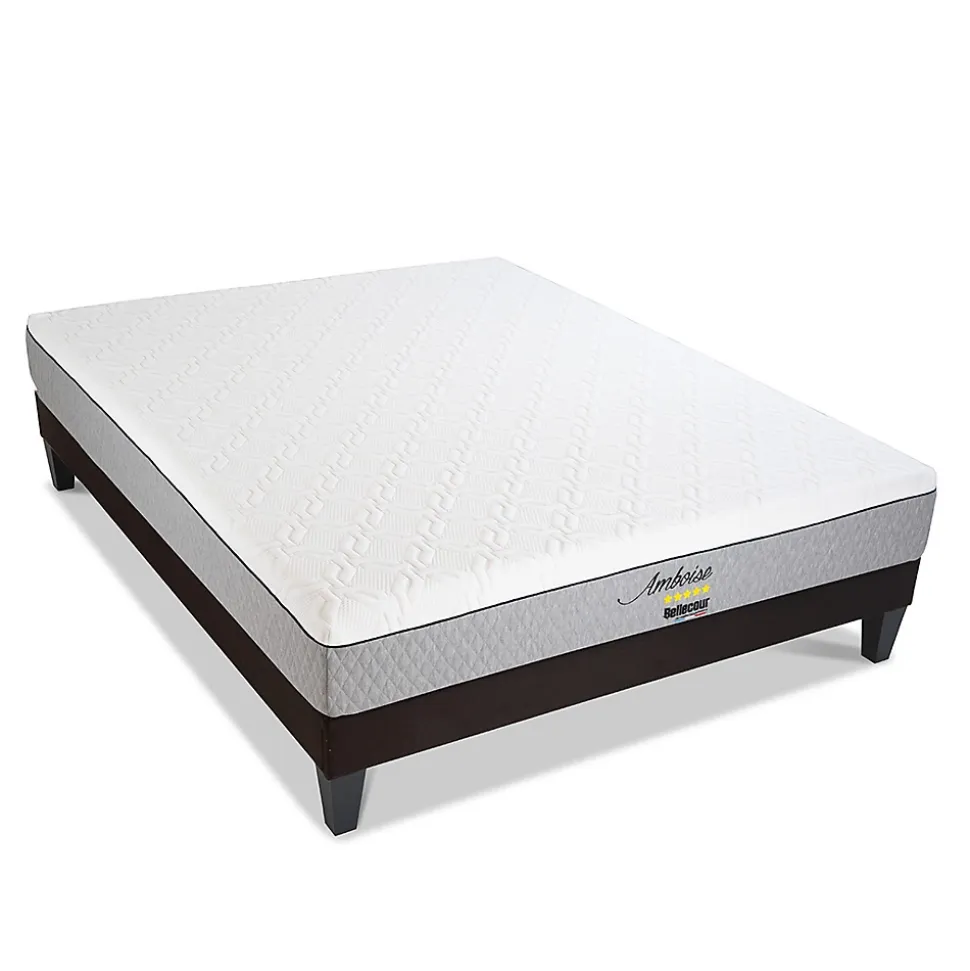 MatelasCARACTERISTIQUES :Dimensions disponibles (cm) : 90×190 – 90×200 – 140×190 – 140×200 – 160×200 – 180x200Epaisseur : 24 cmTechnologie : Mémoire de formeAccueil : EnveloppantSoutien : FermeIndépendance de couchage : 5/5Aération : 4/5Fabrication : FrançaiseDéhoussable : OuiConditionnement : Compressé rouléGarantie : 10 ansCOMPOSITION :Âme intérieure (certifiée CertiPUR) : 17,5 cm de mousse Haute Densité de 33 kg/m³ + 6,5 cm de mousse viscoélastique à mémoire de forme de 60 kg/m³Coutil (labellisé Oeko-Tex) :- Face couchage : Tissu stretch 100% polyester- Face sommier : Tissu stretch 87% polyester et 13% polypropylène- Platebande : Tissu stretch 100% polyesterPOINTS FORTS :ErgonomieSoutienIndépendance de couchageSommierCARACTERISTIQUES :Dimensions disponibles (cm) : 90×190 – 90×200 – 140×190 – 140×200 – 160×200 – 180x200Type de suspension : Lattes activesTechnologie : Tri-lattesHauteur (avec pieds) : 30 cmNombre de pieds : 4Nombre de lattes : 24Matière : BoisCouleur revêtement : GrisConditionnement : En kitGarantie : 5 ansPOINTS FORTS :ConfortFinitions soignéesRobustesseTransport et montage facilesIntégrable dans un cadre de lit