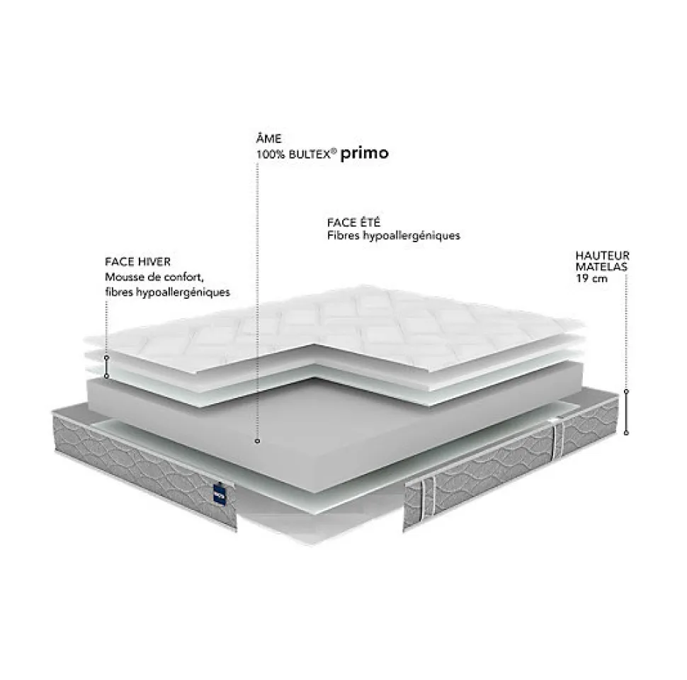 Matelas Back to Basics de Bultex – Gamme PowerLe matelas Back to Basics de Bultex est composé de 100% mousse BULTEX (30 kg/m3 – 15cm)Cette technologie vous offre :- Haute durabilité : un matelas BULTEX est non seulement plus confortable, mais en plus, il le reste.- Aération optimale : un matelas BULTEX reste plus frais, plus longtemps grâce à une meilleure circulation intérieure de l’air.- Innocuité totale : un matelas BULTEX passe haut la main la certification OEKO-TEX et les tests anti-acariens pour vous garantir hygiène et santé- Poids léger : un matelas BULTEX gagne à la fois en légèreté et en qualité. Choisir BULTEX, c’est la garantie d’être en forme le lendemain.La face hiver est composée de mousse de confort 14kg/m3 et de fibres hypoallergéniques (250g/m2) afin de vous offrir une excellente ventilation.Ce matelas est conseillé pour les amateurs de fermeté à la recherche d’un prix attractif.Soutien : FermeAccueil : NormalHauteur : 19cmDescriptif technique :- Soutien : âme 100% Bultex 30kg/m3- Deux faces de couchageFace hiver : Mousse de confort 14kg/m3 et fibres hypoallergéniques 250g/m2Face été : Fibres hypoallergéniques 250g/m2- Coutil stretch 100% polyester – Traitements anti-acariens et antibactérien*- Certification OEKO-TEXBultex note ce matelas :Soutien : FermeAccueil : FermeCe matelas est également appelé « air runner »Garantie 5 ans ou 7 ans avec l’achat conjoint d’un sommier de même marqueFabrication FrançaiseSommier tapissier à lattes massives POWER BULTEX– 12 lattes massives en bois d’épicéa (140×190)– 1 zone de confort– Structure en bois d’ép