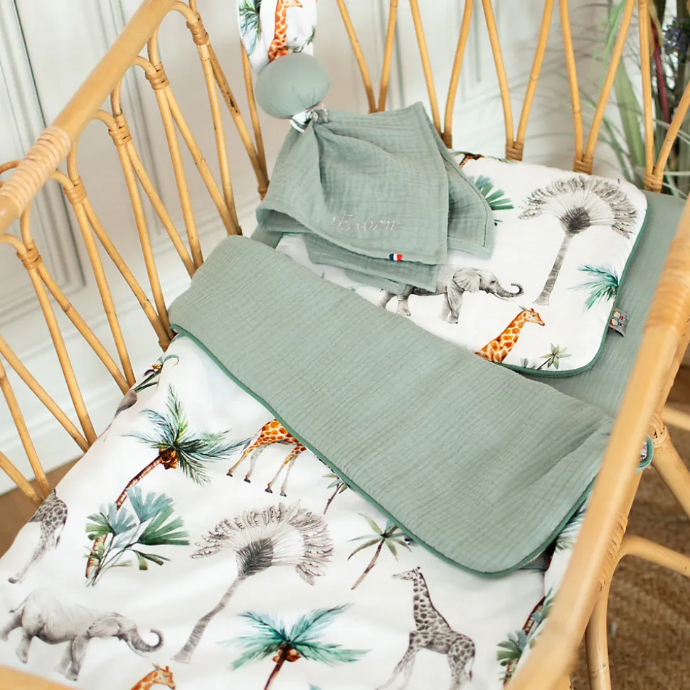 Offrez à bébé un sommeil paisible avec notre ensemble couverture et coussin réversible. Satin de coton imprimé safari et gaze de coton vert de gris, légèrement ouatiné pour un confort toute l’année. Idéal pour berceau, couffin et panier Moïse. Fabrication française, Oeko-Tex.