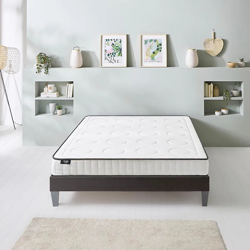 MatelasCARACTERISTIQUES :Dimensions disponibles (cm) : 140×190 – 140×200 – 160×200 – 180x200Epaisseur du matelas : 18 cmTechnologie : Mémoire de formeAccueil : MediumSoutien : FermeIndépendance de couchage : BonneAération : BonneFabrication : EspagneDéhoussable : NonConditionnement : Compressé rouléGarantie : 7 ansCOMPOSITION :Âme intérieure du matelas (certifiée CertiPUR) : 15,5 cm de mousse recyclée de 40 kg/m³Coutil (labellisé Oeko-Tex) :- Face couchage : Tissu stretch de 200 gr/m² – Garnissage 0,5 cm de mousse viscoélastique à mémoire de forme + 100 gr/m² de fibres + 1 cm de mousse- Face sommier : Tissu 2D – Garnissage 100 gr/m² de fibres + 1 cm de moussePOINTS FORTS :ErgonomieSoutienEco-friendlyBon rapport qualité-prixSommierCARACTERISTIQUES :Dimensions disponibles (cm) : 140×190 – 140×200 – 160×200 – 180x200Type de suspension : Lattes activesTechnologie : Tri-lattesHauteur (avec pieds) : 30 cmNombre de pieds : 4Nombre de lattes : 2x24Matière : BoisCouleur revêtement : GrisConditionnement : En kitGarantie : 5 ansPOINTS FORTS :RobustesseConfortHygièneIntégrable dans un cadre de lit