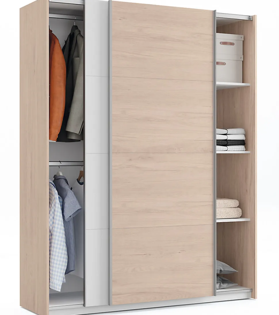 Ensemble de chambre à coucher adulte coloris effet bois / blanc composé de : – Armoire de rangement, en panneaux de particules et mélamine haute densité coloris effet bois / blanc, avec 2 portes coulissantes. – Ensemble 2 tables de chevet + tête de lit coloris effet bois / blanc en panneaux de particules et mélamine haute densité. Tête de lit livrée avec la quincaillerie pour accrocher au mur. Lit, sommier et matelas non inclus Produit de fabrication Espagnol certifié PEFC. Livré en kit. Dimensions armoire : Hauteur 200 x Longueur 150 x Profondeur 62 cm Dimensions des étagères : Hauteur 46 x Longueur 72,5 x Profondeur 53 cm Dimensions totales ensemble : Hauteur 105 x Longueur 212 x Profondeur 36 cm Tête de lit : Hauteur 55 x Longueur 170 x Profondeur 1.6 cm Tables de chevet : Hauteur 42 x Longueur 50 x Profondeur 34 cm Mesures intérieures du tiroir : hauteur 13 x Longueur 40 x profondeur 28,5 cm Hauteur pieds : 3 cm Matière : panneaux de particules et mélamine haute densité Coloris : effet bois / Blanc Poids : 153 KG
