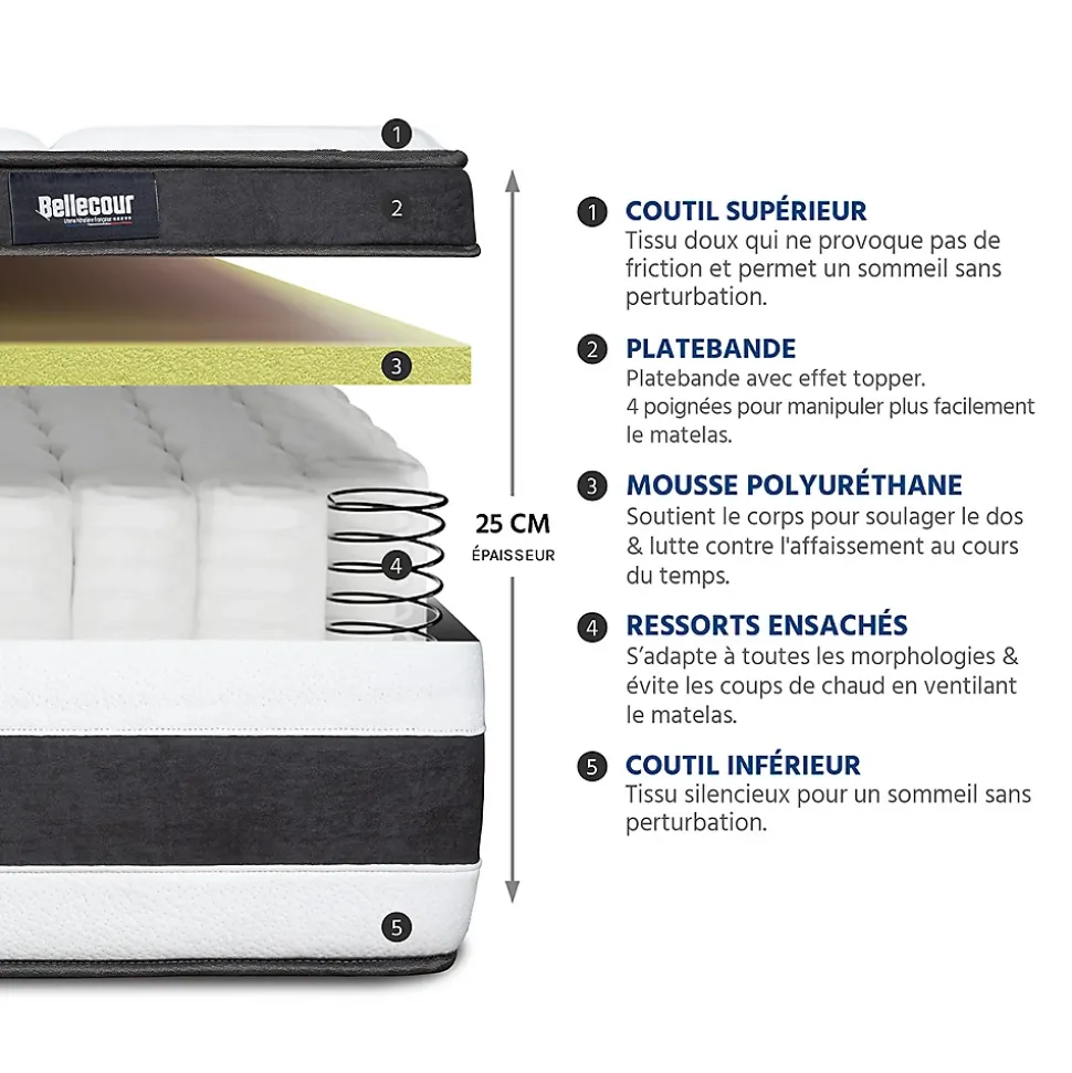- CARACTERISTIQUES : Epaisseur 25 cm – Accueil : Progressif – Soutien : Ferme – Indépendance de couchage : Excellente – Aération : Excellente – Non Déhoussable.
