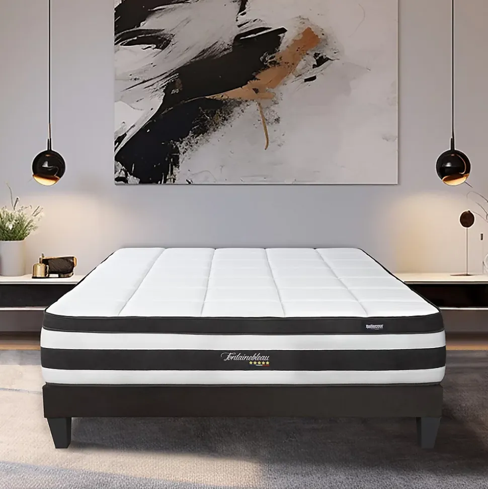 MatelasCARACTERISTIQUES :Dimensions disponibles (cm) : 140×190 – 140×200 – 160×200 – 180x200Epaisseur : 25 cmTechnologie :Ressorts ensachésAccueil : ProgressifSoutien : FermeIndépendance de couchage : 5/5Aération : 5/5Fabrication : UEDéhoussable : NonConditionnement : Compressé rouléGarantie : 10 ansCOMPOSITION :Âme intérieure du matelas : 759 ressorts ensachés de 18 cm + 3 cm de mousse 25 kg/m³ sur la face couchageCoutil :Tissu stretch 250 gr/m² – Garnissage 1,8 cm de mousse viscoélastique à mémoire de forme + 100 gr/m² de fibres (face couchage) / Tissu 3D Basique – Garnissage 100 gr/m² de fibres + 1 cm de mousse (face sommier) / Platebande avec effet topper / 4 poignéesPOINTS FORTS :ErgonomieIndépendance de couchageSoutienVentilationDurabilitéSommierCARACTERISTIQUES :Dimensions disponibles (cm) : 140×190 – 140×200 – 160×200 – 180x200Type de suspension : Lattes activesTechnologie : Tri-lattesHauteur (avec pieds) : 30 cmNombre de pieds : 4Nombre de lattes : 2 x 24Matière : BoisCouleur revêtement : GrisConditionnement : En kitGarantie : 5 ansPOINTS FORTS :RobustesseConfortHygièneIntégrable dans un cadre de lit