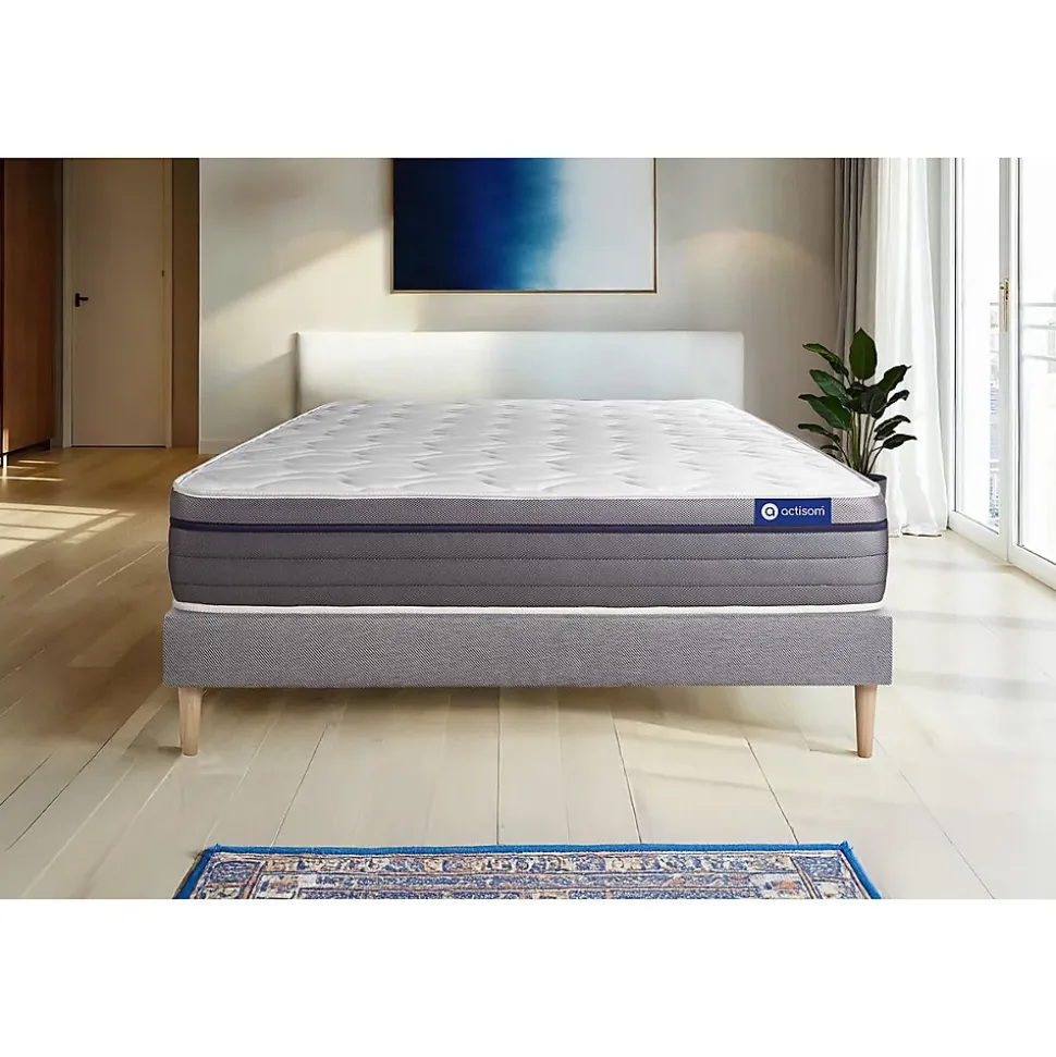 ACTISOM est une marque française développée en partenariat avec les plus grands experts européens du sommeil et de la literie. Après plusieurs années de recherche et de développement, nous avons mis au point des technologies innovantes (Actisoft – Actifresh – Acticell) afin de vous garantir d’excellentes nuits de sommeil. Tous nos matelas sont garantis 7ans et leur fabrication bénéficie d’un contrôle qualité très performant. Nos usines respectent les normes technologiques et environnementales européennes en vigueur.L’avis de notre expert: Le matelas Actilatex ZEN d’une épaisseur de 26cm est un matelas haut de gamme de la marque ACTISOM. Composé de 4 technologies innovantes que sont la mousse mémoire de forme, le latex, la mousse actiSoft et une mousse haute densité, ce matelas vous procure une incroyable sensation de bien-être et de repos. Idéal pour les personnes à la recherche d’une récupération optimale.Epaisseur 26 cmPlateau pour les 2 faces 3cm Latex + Mousse polyuréthane à mémoire de forme + mousse polyuréthane actiSoftBloc mousse polyuréthane haute densité 20cmCoutil 100% polyester micro-perforé ultra respirableConfort Equilibré Type de sommier : Tapissier à lattes démontable à assembler soi mêmeÉpaisseur : 14 cmStructure et traverses de renfort en pin massif2x15 lattes multiplisGarnissage fibres 100% polyester 120G/M2Tissu maille 100% polyester 260G/M2Pieds : Bois 15cm fournisMontage facile : le montage pourra être effectué par une personne seule en seulement 10 minutes Epaisseur 26 cmPlateau pour les 2 faces 3cm Latex + Mousse polyuréthane à mémoire de forme + mousse polyuréthane actiSoftBloc mousse polyuréthane haute densité 20cmCoutil 100% polyester micro-perforé ultra respirableConfort Equilibré Type de sommier : Tapissier à lattes démontable à asse
