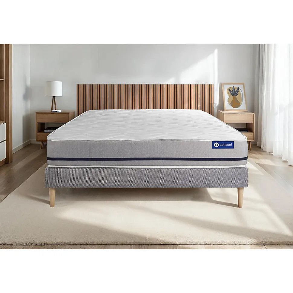 ACTISOM est une marque française développée en partenariat avec les plus grands experts européens du sommeil et de la literie. Après plusieurs années de recherche et de développement, nous avons mis au point des technologies innovantes (Actisoft – Actifresh – Acticell) afin de vous garantir d’excellentes nuits de sommeil. Tous nos matelas sont garantis 7ans et leur fabrication bénéficie d’un contrôle qualité très performant. Nos usines respectent les normes technologiques et environnementales européennes en vigueur.L’avis de notre expert: le matelas Actilatex SOFT bénéficie d’un confort mi-ferme. Il est composé de 3 technologies : Latex, mousse Actisoft et mousse à mémoire de forme qui épouse les formes naturelles du corps et contribue à soulager les points de pression. Cette association de technologies permet de bénéficier d’une parfaite indépendance de couchage. Elle vous assure donc une totale liberté de mouvement.Epaisseur 20 cmPlateau pour les 2 faces 3cm Latex + Mousse polyuréthane à mémoire de forme + mousse polyuréthane actiSoftBloc mousse polyuréthane haute densité 14cmCoutil 100% polyester micro-perforé ultra respirableConfort MI-Ferme Type de sommier : Tapissier à lattes démontable à assembler soi mêmeÉpaisseur : 14 cmStructure et traverses de renfort en pin massif15 lattes multiplisGarnissage fibres 100% polyester 120G/M2Tissu maille 100% polyester 260G/M2Pieds : Bois 15cm fournisMontage facile : le montage pourra être effectué par une personne seule en seulement 10 minutes Epaisseur 20 cmPlateau pour les 2 faces 3cm Latex + Mousse polyuréthane à mémoire de forme + mousse polyuréthane actiSoftBloc mousse polyuréthane haute densité 14cmCoutil 100% polyester micro-perforé ultra respirableConfort MI-Ferme Type de sommier : Tapissier à lattes démontable