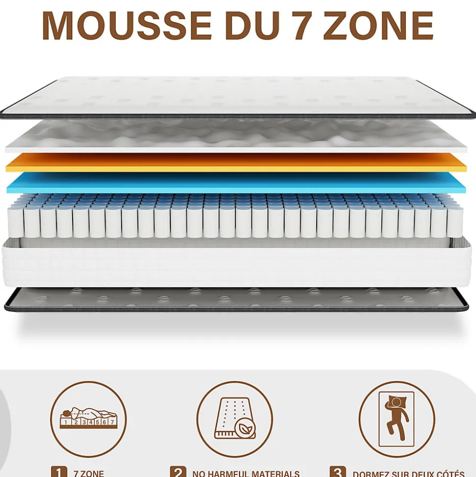 Dimensions du matelas et du cadre de lit: 140 x 190 cm, mousse de polyuréthane haute densité, matelas livré alvéolé et comprimé, cellules fermées – densité 30kgm3 et 1 cm de mousse à mémoire de forme, bandes tridimensionnelles autour du matelas pour une meilleure respirabilité. Le matelas épouse les formes de votre corps, répartit uniformément la pression et offre un grand confort quelle que soit votre position de sommeil.Sommier à lattes : dimensions 140 x 190 cm, hauteur 26 cm, ergonomique, livré avec 7 pieds de lit dévissables, dont 1 pied central pour plus de stabilité. Le sommier à lattes présente une distance plus faible entre les extrémités et le sol, ce qui rend le réseau plus résistant à la pression et lui confère une durée de vie plus longue.Certifications et normes Afin de garantir la qualité des matelas et la qualité des matériaux utilisés pour leur fabrication, les matelas que nous proposons sont certifiés et réglementés par les normes les plus importantes de l’industrie textile, garantissant la qualité et la sécurité : certificat Oeko-tex Trusted Textile, système de qualité, certification ISO 9001, etc.Si vous n’êtes pas satisfait pour quelque raison que ce soit, veuillez nous contacter immédiatement. Attendez 48 à 72 heures pour rétablir l’état d’origine. Fermeté du matelas : Moyennement fermeMatériau de rembourrage : MousseHypoallergénique : OuiHauteur du matelas (cm) : 22Housse amovible : nonDuplex (été/hiver) : OuiDimensions du matelas à déplier : 140x190x22cmLongueur de l’emballage du matelas : 80cmTaille de l’emballage du matelas : 39cmTaille de l’emballage du matelas : 38cmPoids du paquet de matelas : 17,5 kgAvis:1.Veuillez prévoir 48 à 72 heures pour que le matelas reprenne sa forme d’origine.2.En raison de la