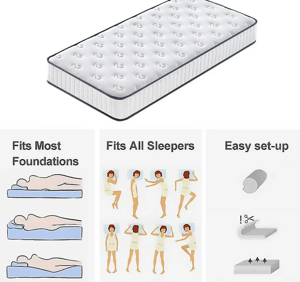 Dimensions du matelas et du cadre de lit: 140 x 190 cm. Epaisseur du Matelas 22cm.Mousse de polyuréthane haute densité, matelas livré alvéolé et comprimé, cellules fermées – densité 30kgm3 et 1 cm de mousse à mémoire de forme, bandes tridimensionnelles autour du matelas pour une meilleure respirabilité. Le matelas épouse les formes de votre corps, répartit uniformément la pression et offre un grand confort quelle que soit votre position de sommeil.Le matelas d’une épaisseur totale de 22 cm est réparti en différentes couches de meilleure composition et qualité. FACILE D’ENTRETIEN ET RESPIRANT : le tissu tricoté de la housse de lit est plus agréable au toucher et permet au matelas de respirer, de dissiper la chaleur et d’absorber l’humidité. Anti-acariens, antibactérien, anti-moisissure et anti-allergie.Sommier à lattes : dimensions 140 x 190 cm, hauteur 29 cm, ergonomique, livré avec 6 pieds de lit dévissables, dont 1 pied central pour plus de stabilité. Le sommier à lattes présente une distance plus faible entre les extrémités et le sol, ce qui rend le réseau plus résistant à la pression et lui confère une durée de vie plus longue.Certifications et normes Afin de garantir la qualité des matelas et la qualité des matériaux utilisés pour leur fabrication, les matelas que nous proposons sont certifiés et réglementés par les normes les plus importantes de l’industrie textile, garantissant la qualité et la sécurité : certificat Oeko-tex Trusted Textile, système de qualité, certification ISO 9001, etc.Si vous n’êtes pas satisfait pour quelque raison que ce soit, veuillez nous contacter immédiatement. Attendez 48 à 72 heures pour rétablir l’état d’origine.Fermeté du matelas : Moyennement fermeMatériau de rembourrage :