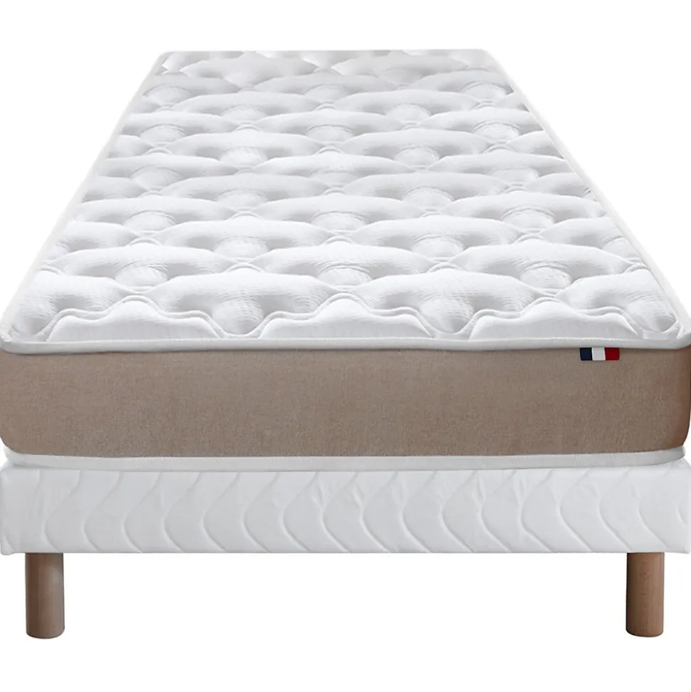 Matelas Accueil Latex 3 zones + Mousse Haute Résilience (durable, souple et rigide à la fois ; une des meilleures du marché) matelas avec accueil latex Il épouse les formes de votre corps pour votre plus grand confort. Vos muscles se relâchent et une sensation d’apesanteur vous envahit pour des nuits paisibles. Caractéristiques : Épaisseur : 18 cm Soutien : Ferme Accueil : Moelleux Composition : Matelas Bi-confort : 1 face latex alvéolé plus enveloppant et respirant (côté bandeau) / 1 face mousse HR plus ferme Ame : 2 cm de latex 60 kg et 12 cm de mousse Haute Résilience 35kg/m3 LATEX : Il faut savoir que le matelas en latex est parmi les matelas les plus aérés. C’est un très bon régulateur de chaleur et d’humidité. Grâce à sa densité, vous obtenez un matelas ferme et un bon soutien. L’indépendance de couchage est également parfaite grâce à un soutien souple et précis. C’est une matière résistante et très confortable. Il est fabriqué à partir de la sève d’hévéa Face hiver : 400 g/m2 ouate polyester hypoallergénique & 2cm de latex de zones de confort différenciées (côté bandeau) Face été : 400 g/m2 ouate polyester hypoallergénique Coutil : Stretch 100 % polyester Traitement : pour une hygiène parfaite, le tissu est traité anti-acariens, antibactériens et hypoallergénique Face de couchage : traitement biocide : 2-octyl-2H-Isothiazol-3-one (26530-20-1) / Fatty alcohol C12-C15 ethoxylated (68131-39-5). Tous nos tissus et mousses sont certifiés par Oeko-Tex. Ce matelas dispose de 2 faces de couchage, pensez à retourner votre matelas tous les 6 mois et à inverser tête et pieds tous les 3 mois pour optimiser sa durée de vie au maximum ! L’utilisation d’un protège-matelas + drap-housse permet également d’assurer à votre literie une protection optimale. Matelas Fabriqué en France Garantie 5 ans Livré roulé Sommier Qu’il soit à lattes ou à ressorts, le sommier supporte un tiers du poids et des mouvements