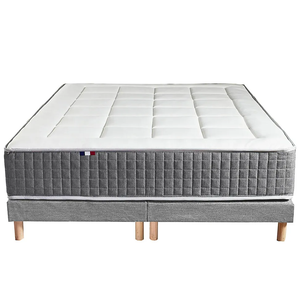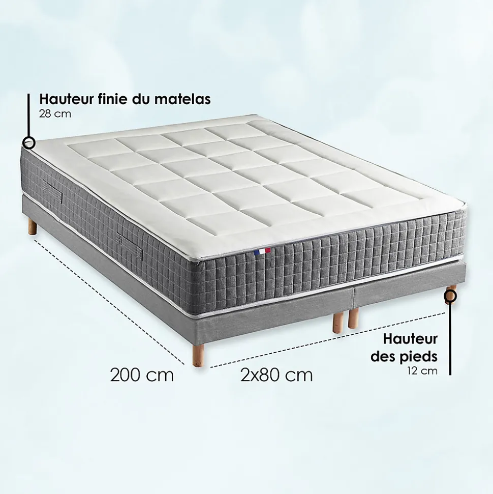 Matelas MAX Profitez d’une indépendance de couchage parfaite avec ce matelas à ressort MAX. Chaque ressort s’adapte indépendamment au mouvement de votre corps, pour votre plus grand confort. Vos muscles se relâchent et une sensation d’apesanteur vous envahit pour des nuits paisibles. CARACTERISTIQUES MATELAS Matelas ressorts ensachés 7 zones de confort Epaisseur totale : 28 cm Soutien : Ferme Le soutien correspond au maintien du corps sur le matelas. Il est assuré par l’âme du matelas. Un matelas ferme permet de garder votre colonne vertébrale alignée. Accueil : Equilibré Ame du matelas : Ressorts ensachés Les ressorts ensachés sont emballés individuellement puis assemblés les uns aux autres. Ils s’adaptent ainsi aux mouvements du corps point par point et favorise l’indépendance de couchage. Fini les nuits perturbées par le mouvement de votre conjoint. Les ressorts permettent également une bonne qualité d’aération pour le matelas et participent ainsi à la durabilité du matelas. Nombre de ressorts : 660 ressorts en 140×190 775 ressorts ensachés en 160×200 868 ressorts ensachés en 180×200 Les ressorts sont isolés par 3 cm de mousse dessus/dessous. 7 zones de confort Profitez de 7 zones de confort différenciées pour un meilleur maintien du dos et un confort personnalisé selon les parties du corps. Zones : tête, épaule, lombaire, bassin, cuisses, jambes et pieds. Matelas réversible La face hiver : 200 g/m2 ouate hypoallergenique + 9mm de mousse (côté dessin prestige piquage carré) La face été : 200 g/m2 ouate hypoallergenique + 5mm de mousse (côté dessin piquage ligne droite) Cout
