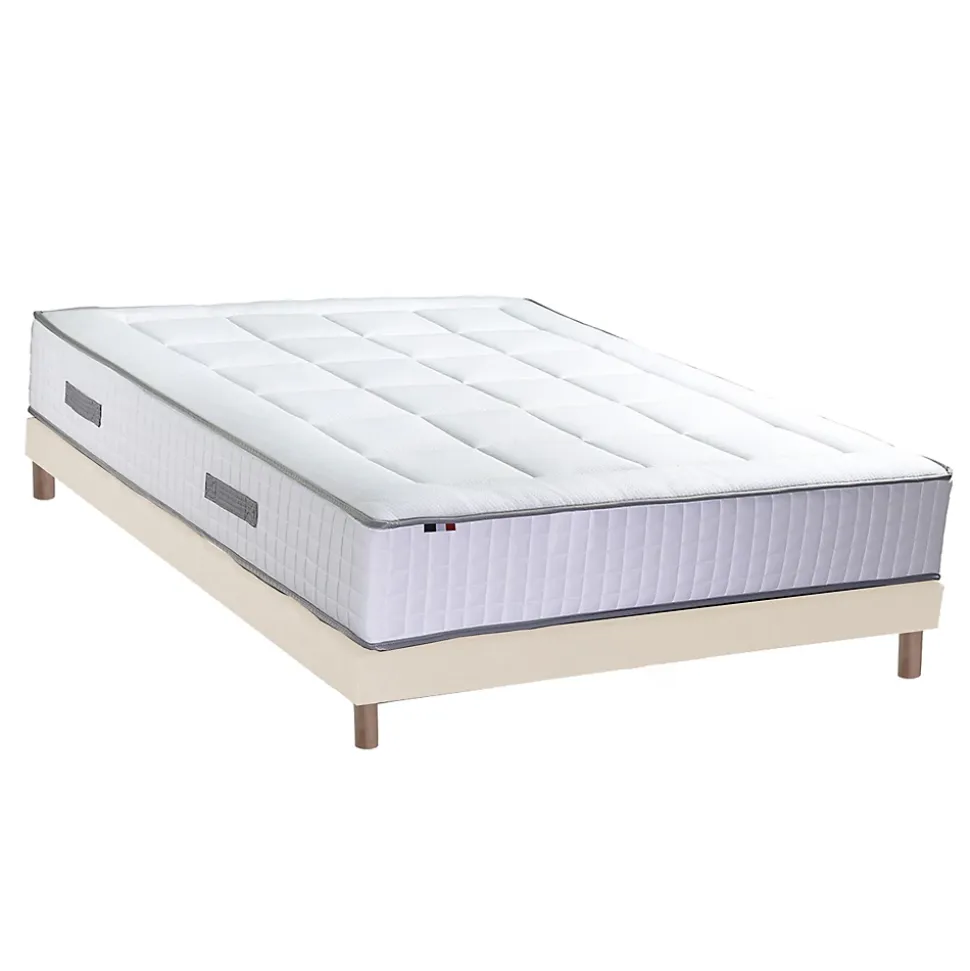 Ensemble Palacio – confort, durabilité et qualité française Simplifiez votre aménagement avec l’ensemble PALACIO, une solution complète réunissant un matelas à ressorts ensachés 7 zones, un sommier tapissier en kit beige. Cet ensemble garantit un confort équilibré, une hygiène parfaite et une fabrication française durable, pour des nuits paisibles toute l’année. Matelas Palacio – soutien ferme et accueil moelleux Le matelas PALACIO, hauteur 25 cm, associe un accueil moelleux à un soutien ferme grâce à sa technologie de ressorts ensachés (de 660 à 868 ressorts selon la taille). Chaque ressort réagit indépendamment pour un maintien point par point du corps et une indépendance de couchage optimale, idéale pour les couples. Sa structure aérée et ses 3 cm de mousse isolante garantissent une excellente circulation de l’air et une durabilité accrue. Matelas garanti 5 ans Ergonomie 7 zones et matelas réversible Conçu avec 7 zones de confort différenciées (tête, épaules, dos, bassin, cuisses, jambes, pieds), il répartit uniformément la pression et maintient la colonne vertébrale dans une position naturelle. Le matelas est réversible pour prolonger sa durée de vie et offrir un confort adapté à chaque saison : • Face hiver : Pour une chaleur douce et enveloppante. • Face été : Pour une meilleure respirabilité lors des nuits chaudes. Tissus certifiés oeko-tex et traitement sain Le coutil stretch 100 % polyester est certifié Oeko-Tex Standard 100. L’entretien est facilité : un simple retourn