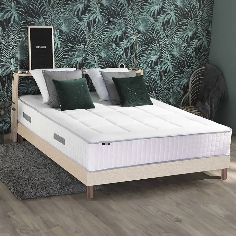 Ensemble Palacio – confort, durabilité et qualité française Simplifiez votre aménagement avec l’ensemble PALACIO, une solution complète réunissant un matelas à ressorts ensachés 7 zones, un sommier tapissier en kit beige. Cet ensemble garantit un confort équilibré, une hygiène parfaite et une fabrication française durable, pour des nuits paisibles toute l’année. Matelas Palacio – soutien ferme et accueil moelleux Le matelas PALACIO, hauteur 25 cm, associe un accueil moelleux à un soutien ferme grâce à sa technologie de ressorts ensachés (de 660 à 868 ressorts selon la taille). Chaque ressort réagit indépendamment pour un maintien point par point du corps et une indépendance de couchage optimale, idéale pour les couples. Sa structure aérée et ses 3 cm de mousse isolante garantissent une excellente circulation de l’air et une durabilité accrue. Matelas garanti 5 ans Ergonomie 7 zones et matelas réversible Conçu avec 7 zones de confort différenciées (tête, épaules, dos, bassin, cuisses, jambes, pieds), il répartit uniformément la pression et maintient la colonne vertébrale dans une position naturelle. Le matelas est réversible pour prolonger sa durée de vie et offrir un confort adapté à chaque saison : • Face hiver : Pour une chaleur douce et enveloppante. • Face été : Pour une meilleure respirabilité lors des nuits chaudes. Tissus certifiés oeko-tex et traitement sain Le coutil stretch 100 % polyester est certifié Oeko-Tex Standard 100. L’entretien est facilité : un simple retourn