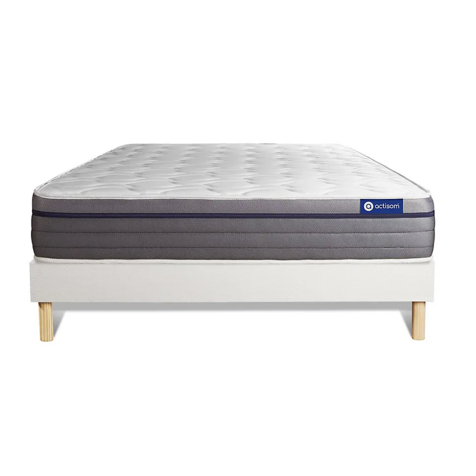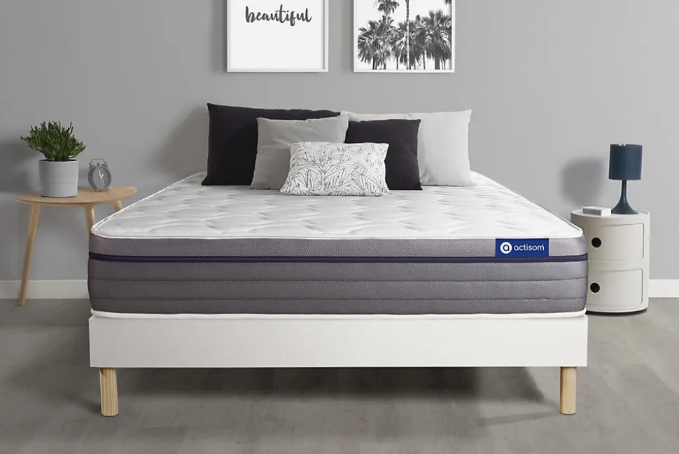 ACTISOM est une marque française développée en partenariat avec les plus grands experts européens du sommeil et de la literie. Après plusieurs années de recherche et de développement, nous avons mis au point des technologies innovantes (Actisoft – Actifresh – Acticell) afin de vous garantir d’excellentes nuits de sommeil. Tous nos matelas sont garantis 7ans et leur fabrication bénéficie d’un contrôle qualité très performant. Nos usines respectent les normes technologiques et environnementales européennes en vigueur.L’avis de notre expert: Le matelas Actimemo ZEN dispose d’une maxi épaisseur de 26cm. Son accueil enveloppant à mémoire de forme, sur les deux faces été/hiver, allège les points de pressions. Son âme en mousse haute densité dotée de 7zones de confort apporte un soutien ferme, idéal pour le bon maintien de votre dos. Il dispose de la technologie ActiFresh qui optimise l’hygiène du matelas.• Epaisseur 26 cm• Plateau pour les 2 faces 2,5cm Mousse polyuréthane à mémoire de forme + mousse polyuréthane actiSoft• Soutien en mousse polyuréthane haute densité 21cm• Coutil 100% polyester micro-perforé ultra respirable• Confort Equilibré• Type de sommier : Tapissier à lattes démontable à assembler soi même• Épaisseur : 14 cm• Structure et traverses de renfort en pin massif• 15 lattes multiplis• Garnissage fibres 100% polyester 120G/M2• Tissu maille 100% polyester 260G/M2• Pieds : Bois 15cm fournis• Montage facile : le montage pourra être effectué par une personne seule en seulement 10 minutes • Epaisseur 26 cm• Plateau pour les 2 faces 2,5cm Mousse polyuréthane à mémoire de forme + mousse polyuréthane actiSoft• Soutien en mousse polyuréthane haute densité 21cm• Coutil 100% polyester micro-perforé ultra respirable• Confort Equilibré• Type de sommier : Tapissier à lattes démontable à assembler soi même• Épaisseur : 14 cm• Structure et traverses de re