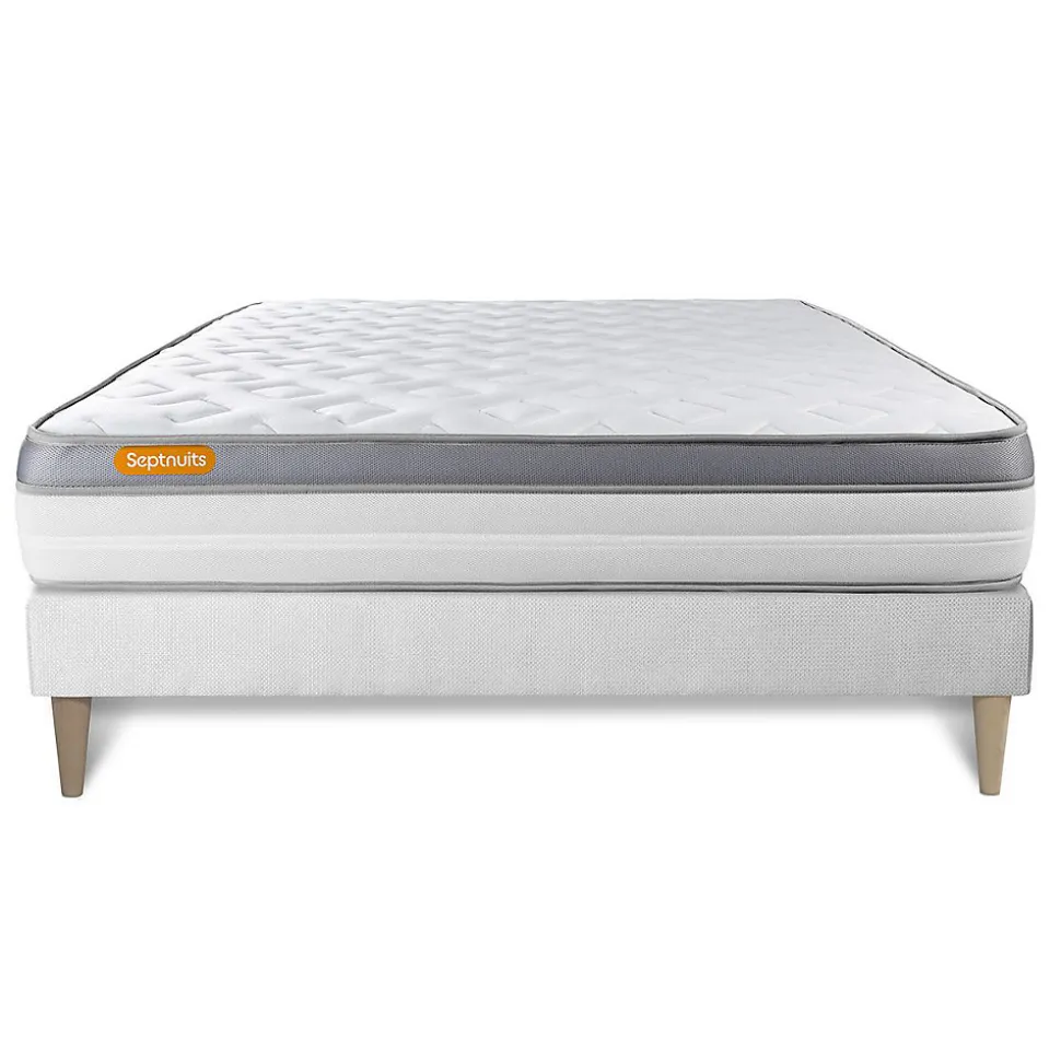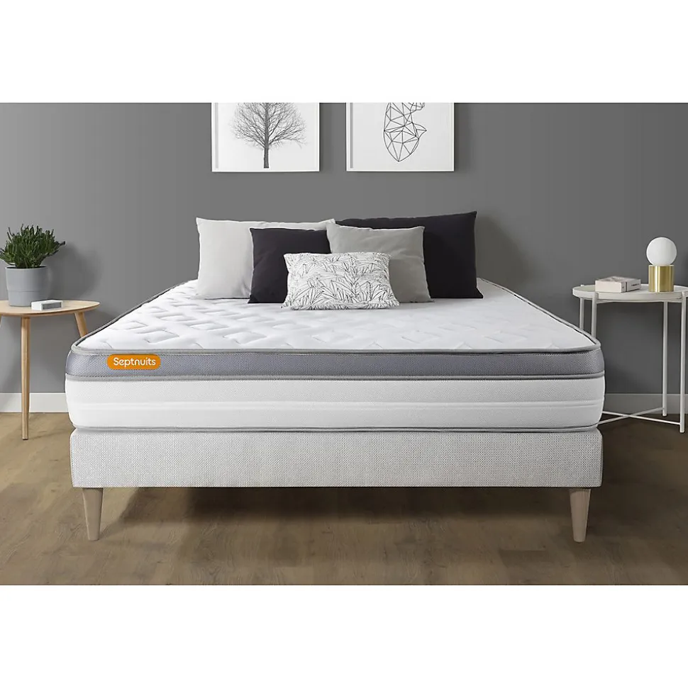 Le matelas Memo Zen de la marque Septnuits bénéficie des dernières innovations en matière de mousse à mémoire de forme pour vous offrir le confort et le soutien unique pour un sommeil récupérateur. Avec un soutien ferme, son accueil à mémoire de forme s’adapte parfaitement à votre morphologie et allège les points de pression en épousant parfaitement votre corps. Ses matériaux de haute qualité : Plate-bande 3D micro aérée, son coutil ultra respirable et sa fibre polyester vous garantissent une aération totale du matelas pour une hygiène optimale.- Type de matelas : Mémoire de forme- Epaisseur : 26 cm- Confort : ferme- Accueil : Ferme avec 2,5 cm de mousse polyuréthane à mémoire de forme D55kg + 2 cm mousse polyuréthane Hypersoft + Fibres 100% Polyester 350G/M2- Soutien : Ferme composé de mousse polyuréthane Haute Densité 21 cm- Indépendance de couchage : Très bonne- Coutil : Tissu 100% polyester Micro perforé ultra-respirable- Bande latérale : Tissu 100% polyester Micro perforé ultra-respirable- Face de couchage : Réversible- Densité : 55 kg/m3- Certification : Label Oeko-Tex Standard 100- Nos matières premières sont certifiées par le label textile OEKO-TEX- Sommier tapissier à assembler soi même- Nombre de lattes : 2×15 lattes multiplis- Structure et traverses de renfort en pin massif- Garnissage fibres 100% Polyester 120G/M2- Tissu Maille 100% polyester 260 G/M2- Hauteur 14cm + Pieds bois en pin naturel 15cm – Type de matelas : Mémoire de forme- Epaisseur : 26 cm- Confort : ferme- Accueil : Ferme avec 2,5 cm de mousse polyuréthane à mémoire de forme D55kg + 2 cm mousse polyuréthane Hypersoft + Fibres 100% Polyester 350G/M2- Soutien : Ferme composé de mousse polyuréthane Haute Densité 21 cm- Indépendance de couchage : Très bonne- Coutil : Tissu 100% polyester Micro perforé ultra-respirable- Bande latérale : Tissu 100% polyester
