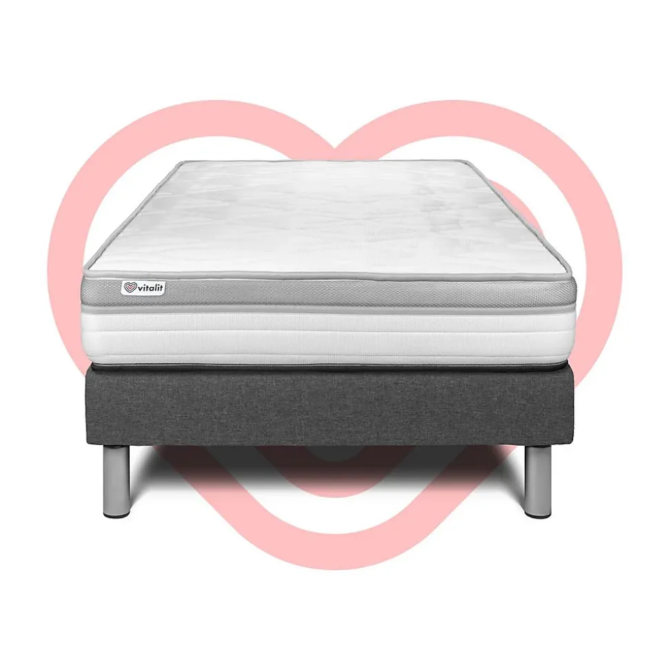 Faites le plein d’énergie positive grâce aux solutions de literie énergisantes Vitalit qui allient confort, maintien et souplesse et permettre à votre corps de prendre le temps de se revitaliser. Les matelas et sommiers Vitalit sont pensés pour s’adapter aux spécificités corporelles et au sommeil de chacun. De fabrication portugaise, les produits Vitalit sont rigoureusement élaborés selon des cahiers des charges précis. Jusqu’à la livraison, notre objectif : votre satisfaction.Le matelas VITAL RELAX bénéficie des dernières innovations en matière de mousse polyuréthane haute densité. D’une épaisseur de 18 cm, son soutien est ferme et son accueil dynamique. Il maintient parfaitement l’alignement votre colonne vertébrale pour des nuits relaxantes.Épaisseur : 18 cmÂme 100% mousse polyuréthane Haute Densité 15 cmFibres 100% Polyester 350G/M2Plate-Bande 3D micro-aérée 100% Polyester pour optimiser l’aération du matelasCoutil micro perforé ultra respirable 100% PolyesterConfort :Accueil ferme – Soutien fermeSoutien ferme3 zones de confortSommierSommier Tapissier à lattes en kit à assembler soi mêmeNombre de lattes : 15 lattes multiplisStructure et traverses de renfort en pin massifTissu Maille 100% polyester 345G/M2 respirable et résistant certifié OEKO-TEX Standard 100Hauteur 14cm + Pieds acier 15cm (fournis)Adapté pour tous types de matelasMontage facile par une personne seule en moins de 15 min Épaisseur : 18 cmÂme 100% mousse polyuréthane Haute Densité 15 cmFibres 100% Polyester 350G/M2Plate-Bande 3D micro-aérée 100% Polyester pour optimiser l’aération du matelasCoutil micro perforé ultra respirable 100% PolyesterConfort :Accueil ferme – Soutien fermeSoutien ferme3 zones de confortSommierSommier Tapissier à lattes en ki