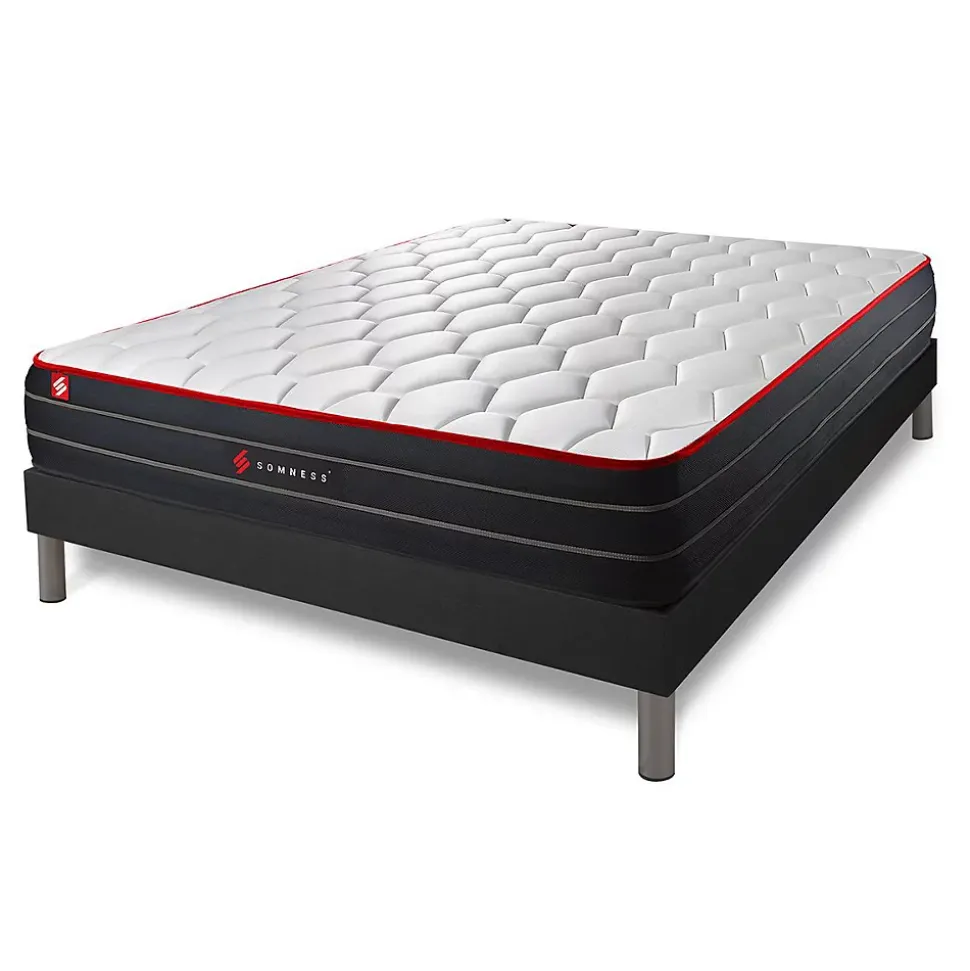 Le matelas BOOST est l’aboutissment de plusieurs années de recherche et développement. L’alliance de la mousse à mémoire de fome et des ressorts ensachés en fait l’un des modèles les plus haut de gamme de la marque Somness.L’avis de notre expert: Ce matelas dispose d’une maxi épaisseur de 26cm, d’un confort inégalé, votre corps le remerciera chaque matin.- Type de matelas : Mémoire de forme et ressorts ensachés- Epaisseur : 26 cm- Confort : Equilibré- Accueil : Moelleux avec 4cm mousse polyuréthane à mémoire de forme + mousse soft pour les 2 faces- Soutien : 961 Ressorts ensachés- Indépendance de couchage : Excellente- Zone de confort : 7 zones de confort- Coutil 100% polyester micro perforé ultra-respirable- Plate-Bande en tissu 3D micro-perforé 100% Polyester pour optimiser l’aération du matelas- Face de couchage : Face été / Face hiver- Densité : 55 kg/m3- Certification : Oeko-Tex- Type de sommier : Tapissier à lattes démontable à assembler soi même- Epaisseur du sommier : 14cm- Nombre de lattes : 2×15 lattes multiplis- Garnissage fibres 100% polyester 120G/M2- Tissu Maille 100% polyester 260 G/M2- Pieds : Acier 15cm fournis- Hauteur 14cm + Pieds acier 15cm- Montage facile: le montage pourra être effectué par une personne seule en 10 min seulement – Type de matelas : Mémoire de forme et ressorts ensachés- Epaisseur : 26 cm- Confort : Equilibré- Accueil : Moelleux avec 4cm mousse polyuréthane à mémoire de forme + mousse soft pour les 2 faces- Soutien : 961 Ressorts ensachés- Indépendance de couchage : Excellente- Zone de confort : 7 zones de confort- Coutil 100% polyester micro perforé ultra-respirable- Plate-Bande en tissu 3D micro-perforé 100% Polyester pour optimiser l’aération du matelas- Face de couchage : Face été / Face hiver- Densité : 55 kg/m3- Certification : Oeko-Tex- Ty