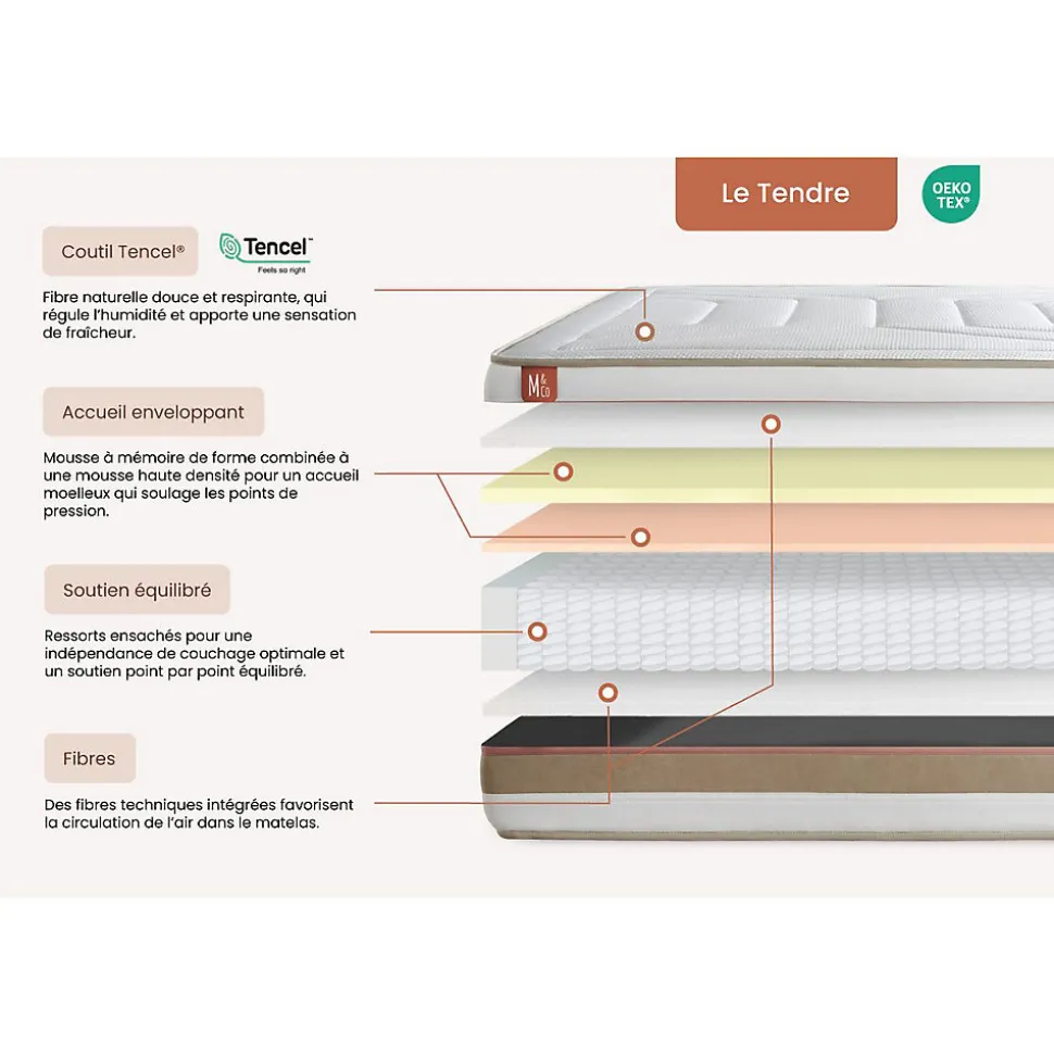 À toi qui peux dormir douze heures d’affilée sans jamais te réveiller… À toi qui troques régulièrement ton café contre quelques précieuses minutes de gagnées… À toi, l’oiseau de nuit, qui retrouves au petit matin ton lit chéri… chez Marmottes & Co, nous avons le nid douillet qu’il te faut. Nous avons developpé une gamme de produits couvrant toutes les sensations de confort recherchées grace à des technologies éprouvées associées à des matières naturelles. Tous nos matelas, sommiers et accessoires sont fabriqués au Portugal, dans la région du Val d’Ave, région reconnue pour son savoir-faire textile transmis de générations en générations. Nous travaillons en étroite collaboration avec nos fournisseurs à chaque étape, de la conception à la fabrication de nos produits, afin qu’ils soient conformes à nos exigences et qu’ils comblent vos attentes. Tous nos produits sont conçus, contrôlés, testés avec la plus grande rigueur. Ils portent le label Oeko-Tex qui garantit l’absence de substances nocives pour la peau.Avis aux grands amateurs de tendresse ! Le matelas TENDRE de Marmottes&Co allie avec brio un accueil enveloppant et les ressorts ensachés pour soulager les zones de pression. De plus, son coutil en TENCEL issu du bois d’eucalyptus est absorbant et ultra-respirant. Un confort équilibré inégalable pour des conditions de repos sensationnelles.> Epaisseur 28 cm> Soutien équilibré composé d’une âme en ressorts ensachés> Nombre de ressorts ensachés : 290 pour 80×190, 310 pour 80×200, 348 pour 90×190, 372 pour 90×200, 493 pour 120×190, 527 pour 120×200, 609 pour 140×190, 651 pour 140×200, 744 pour 160×200, 806 pour 180×200, 961 pour 200×200> Accueil Enveloppant: Mousse polyuréthane à mémoire de forme et mousse polyuréthane Haute Densité de 2 cm > Fibre 100% polyester 350G/m2> Plate-Bande 3D micro-aérée pour optimiser l’aération du matelas 100% polyester> Coutil fibre naturelle ultra respirable et absorbant 35% > Epaisseur