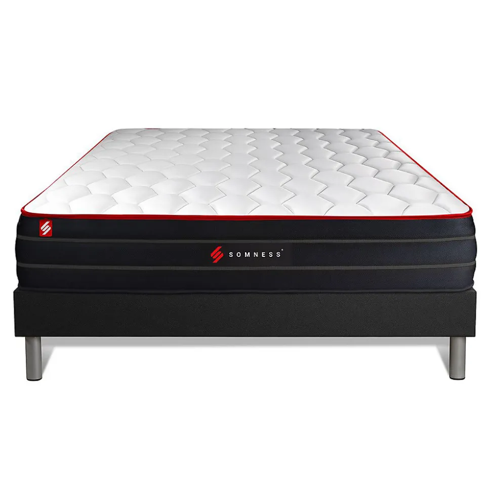 Le matelas BOOST est l’aboutissment de plusieurs années de recherche et développement. L’alliance de la mousse à mémoire de fome et des ressorts ensachés en fait l’un des modèles les plus haut de gamme de la marque Somness.L’avis de notre expert: Ce matelas dispose d’une maxi épaisseur de 26cm, d’un confort inégalé, votre corps le remerciera chaque matin.- Type de matelas : Mémoire de forme et ressorts ensachés- Epaisseur : 26 cm- Confort : Equilibré- Accueil : Moelleux avec 4cm mousse polyuréthane à mémoire de forme + mousse soft pour les 2 faces- Soutien : 609 Ressorts ensachés- Indépendance de couchage : Excellente- Zone de confort : 7 zones de confort- Coutil 100% polyester micro perforé ultra-respirable- Plate-Bande en tissu 3D micro-perforé 100% Polyester pour optimiser l’aération du matelas- Face de couchage : Face été / Face hiver- Densité : 55 kg/m3- Certification : Oeko-Tex- Type de sommier : Tapissier à lattes démontable à assembler soi même- Epaisseur du sommier : 14cm- Nombre de lattes : 2×15 lattes multiplis- Garnissage fibres 100% polyester 120G/M2- Tissu Maille 100% polyester 260 G/M2- Pieds : Acier 15cm fournis- Hauteur 14cm + Pieds acier 15cm- Montage facile: le montage pourra être effectué par une personne seule en 10 min seulement – Type de matelas : Mémoire de forme et ressorts ensachés- Epaisseur : 26 cm- Confort : Equilibré- Accueil : Moelleux avec 4cm mousse polyuréthane à mémoire de forme + mousse soft pour les 2 faces- Soutien : 609 Ressorts ensachés- Indépendance de couchage : Excellente- Zone de confort : 7 zones de confort- Coutil 100% polyester micro perforé ultra-respirable- Plate-Bande en tissu 3D micro-perforé 100% Polyester pour optimiser l’aération du matelas- Face de couchage : Face été / Face hiver- Densité : 55 kg/m3- Certification : Oeko-Tex- Ty