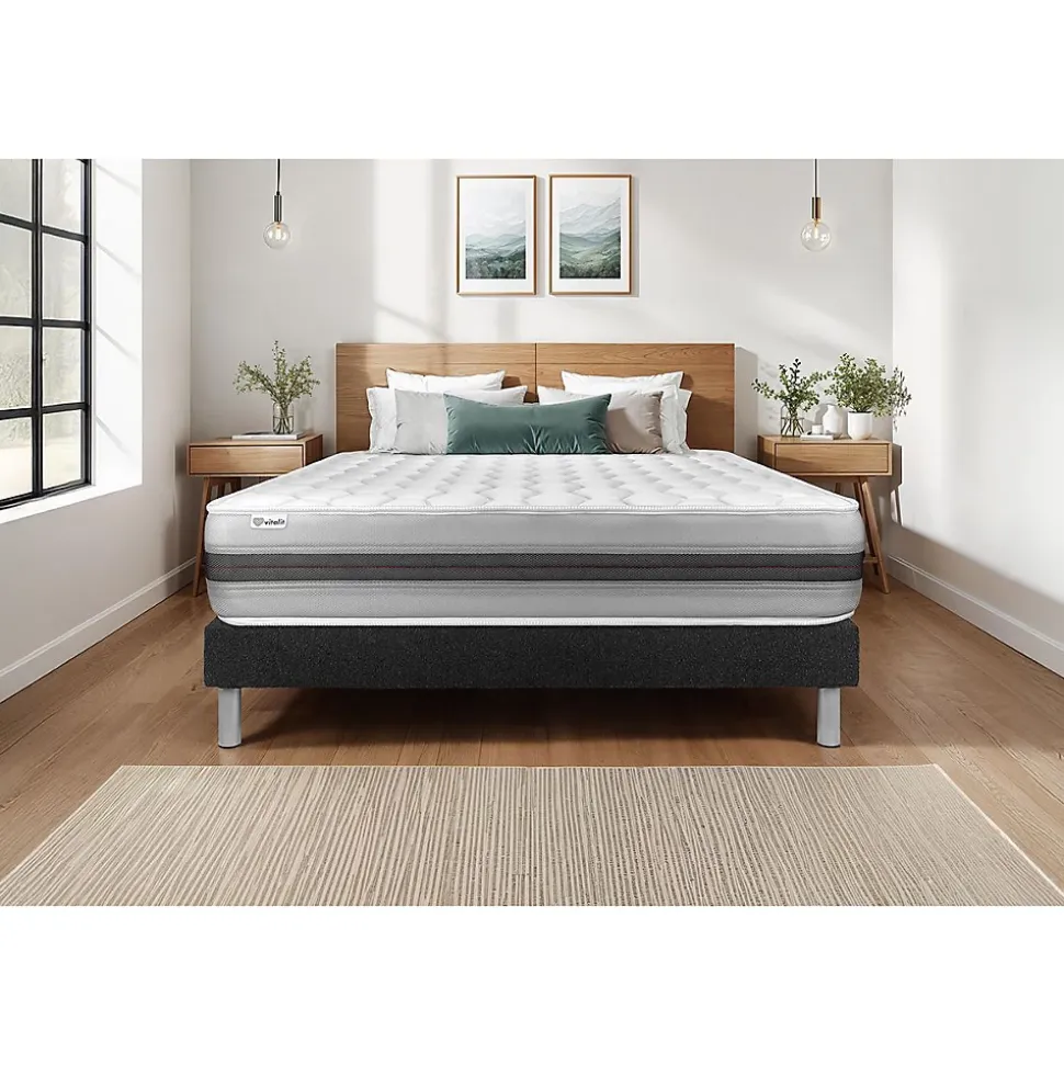 Faites le plein d’énergie positive grâce aux solutions de literie énergisantes Vitalit qui allient confort, maintien et souplesse et permettre à votre corps de prendre le temps de se revitaliser. Les matelas et sommiers Vitalit sont pensés pour s’adapter aux spécificités corporelles et au sommeil de chacun. De fabrication portugaise, les produits Vitalit sont rigoureusement élaborés selon des cahiers des charges précis. Jusqu’à la livraison, notre objectif : votre satisfaction.D’une maxi épaisseur de 28 cm, le Matelas hybride VITALSPRING RECOVER bénéficie de l’alliance des technologies ressorts et mousse à mémoire de forme. Les ressorts ensachés permettent un soutien ferme et une excellente indépendance de couchage et durable tandis que la mousse à mémoire de forme vous procure un accueil enveloppant. Son coutil micro perforé permet une aération optimisée.Epaisseur 28 cmÂme ressorts ensachés 17 cmNombre de ressorts ensachés : 372 pour le 90x200cmCarénage mousse polyuréthane 30kgMousse polyuréthane à mémoire de forme D 55 kg + Mousse polyuréthane Soft HDFibres 100% Polyester 350G/M2Coutil micro perforé ultra respirable 100% Polyester7 zones de confortConfort : ÉquilibréAccueil moelleuxSoutien fermeSommier tapissierMulti 12 lattes en peuplier massifStructure et traverses de renfort en peuplier massifGarnissage fibres 100% polyester 120G/M2Tissu Maille 100% polyester 855G/M2 respirableToile de fond 100% polyester anti-poussièresHauteur 14cm + Pieds acier 15cm (fournis)Adapté pour tous types de matelasLivré assemblé Epaisseur 28 cmÂme ressorts ensachés 17 cmNombre de ressorts ensachés : 372 pour le 90x200cmCarénage mousse polyuréthane 30kgMousse polyuréthane à mémoire de forme D 55 kg + Mousse polyuréthane Soft HDFib