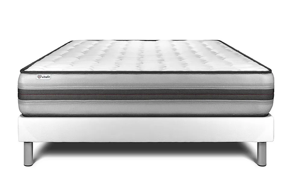 Faites le plein d’énergie positive grâce aux solutions de literie énergisantes Vitalit qui allient confort, maintien et souplesse et permettre à votre corps de prendre le temps de se revitaliser. Les matelas et sommiers Vitalit sont pensés pour s’adapter aux spécificités corporelles et au sommeil de chacun. De fabrication portugaise, les produits Vitalit sont rigoureusement élaborés selon des cahiers des charges précis. Jusqu’à la livraison, notre objectif : votre satisfaction.Avec ses 26 cm d’épaisseur, le matelas hybride haut de gamme VITALPOWER RECOVER bénéficie de l’alliance technologique des ressorts ensachés et mousse à mémoire de forme. D’un soutien ferme, son accueil enveloppant s’adapte à votre morphologie et allège les points de pression. Son coutil micro perforé garantie une aération optimisée. Recharger vos batteries durant votre sommeil avec le matelas VITALPOWER RECOVER.Type de matelas : Mémoire de forme et ressorts ensachésEpaisseur : 26 cmMicro perforé ultra-respirableCarénage mousse polyuréthane 30kgMousse polyuréthane à mémoire de forme D 55 kg + Mousse polyuréthane Soft HDFibres 100% Polyester 350G/M2Nombre de ressorts ensachés : 744 pour le 160x200cmPlate-Bande 3D micro-aérée 100% Polyester pour optimiser l’aération du matelasCoutil micro perforé ultra respirable 100% PolyesterConfort : Equilibré – Accueil moelleux – Soutien fermeFace de couchage : Face été / Face hiverDensité : 55 kg/m3Certification : Oeko-TexSommier tapissierMulti 12 lattes en peuplier massifStructure et traverses de renfort en peuplier massifGarnissage fibres 100% polyester 120G/M2Tissu Maille 100% polyester 260G/M2 respirableToile de fond 100% polyester anti-poussièresHauteur 14cm + Pieds acier 15cm (fournis)Adapté pour tous types de matelasLivré assemblé <