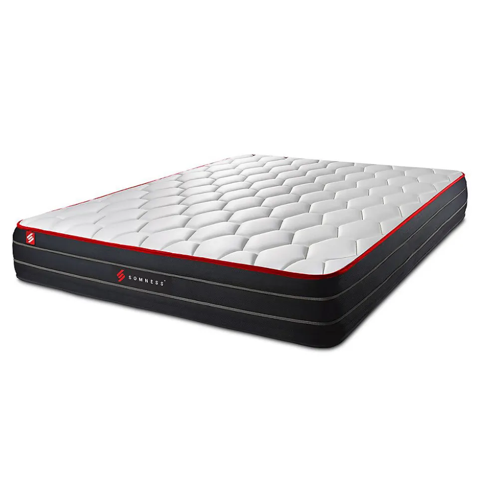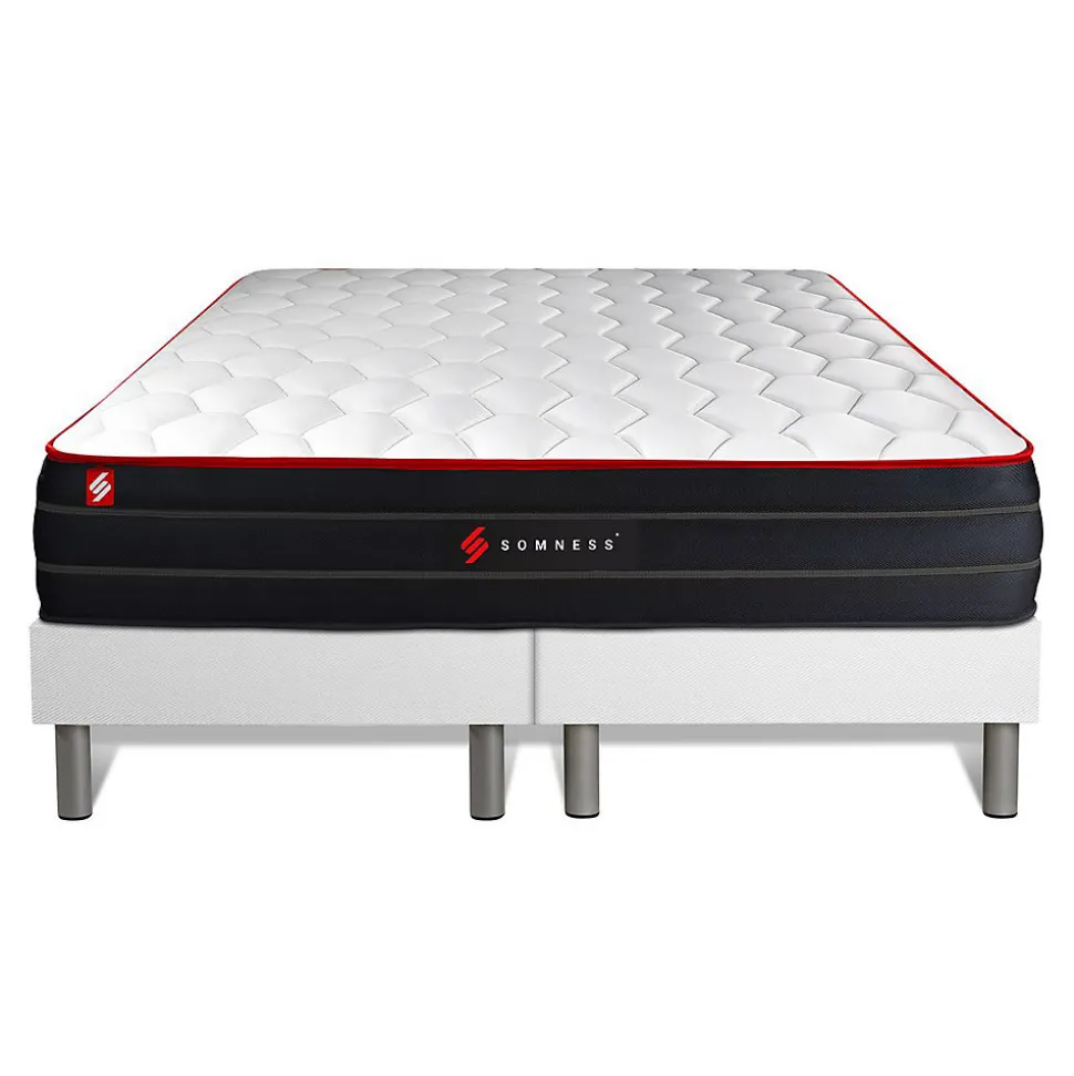 Le matelas BOOST est l’aboutissment de plusieurs années de recherche et développement. L’alliance de la mousse à mémoire de fome et des ressorts ensachés en fait l’un des modèles les plus haut de gamme de la marque Somness.L’avis de notre expert: Ce matelas dispose d’une maxi épaisseur de 26cm, d’un confort inégalé, votre corps le remerciera chaque matin.- Type de matelas : Mémoire de forme et ressorts ensachés- Epaisseur : 26 cm- Confort : Equilibré- Accueil : Moelleux avec 4cm mousse polyuréthane à mémoire de forme + mousse soft pour les 2 faces- Soutien : 961 Ressorts ensachés- Indépendance de couchage : Excellente- Zone de confort : 7 zones de confort- Coutil 100% polyester micro perforé ultra-respirable- Plate-Bande en tissu 3D micro-perforé 100% Polyester pour optimiser l’aération du matelas- Face de couchage : Face été / Face hiver- Densité : 55 kg/m3- Certification : Oeko-Tex- Sommier tapissier- Multi 12 lattes en peuplier massif- Structure et traverses de renfort en peuplier massif- Garnissage fibres 100% polyester 120G/M2- Tissu Maille 100% polyester 260G/M2- Toile de fond anti-poussières 100% polyester- Hauteur 14cm + Pieds acier 15cm – Type de matelas : Mémoire de forme et ressorts ensachés- Epaisseur : 26 cm- Confort : Equilibré- Accueil : Moelleux avec 4cm mousse polyuréthane à mémoire de forme + mousse soft pour les 2 faces- Soutien : 961 Ressorts ensachés- Indépendance de couchage : Excellente- Zone de confort : 7 zones de confort- Coutil 100% polyester micro perforé ultra-respirable- Plate-Bande en tissu 3D micro-perforé 100% Polyester pour optimiser l’aération du matelas- Face de couchage : Face été / Face hiver- Densité : 55 kg/m3- Certification : Oeko-Tex- Sommier tapissier- Multi 12 lattes en peuplier massif- Structure et traverses de renfort en peuplier