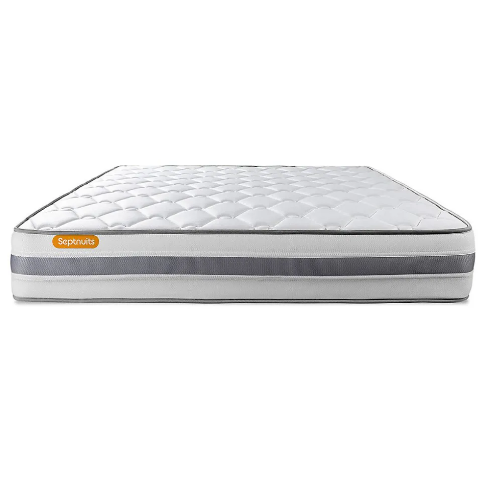 Le matelas Memo Spring de la marque Septnuits est constitué d’une âme en ressorts ensachés procurant un soutien très précis point par point avec 3 zones différenciées. Sa conception unique vous offrira un soutien ferme et un accueil dynamique. Sa Plate-bande 3D micro aérée, associée à son coutil micro perforé ultra respirable et sa fibre polyester vous garantissent une ventilation active du matelas. Sa maxi épaisseur vous assure une nuit de bien-être. Son plus ses ressorts ensachés pour une parfaite indépendance de couchage.- Type de matelas : Mémoire de forme- Epaisseur : 22 cm- Confort : ferme- Accueil : Ferme avec 2,5 cm de mousse polyuréthane à mémoire de forme D55kg + 2 cm mousse polyuréthane Hypersoft + Fibres 100% Polyester 350G/M2- Soutien : Ame 651 Ressorts ensachés- Indépendance de couchage : Très bonne- Coutil : Tissu 100% polyester Micro perforé ultra-respirable- Bande latérale : Tissu 100% polyester Micro perforé ultra-respirable- Face de couchage : Réversible- Densité : 55 kg/m3- Certification : Label Oeko-Tex Standard 100- Nos matières premières sont certifiées par le label textile OEKO-TEX- Sommier tapissier Monobloc- Nombre de lattes : Multi 12 lattes en peuplier massif- Structures et traverses de renfort en peuplier massif- Garnissage fibres 100% Polyester 120G/M2- Tissu Maille 100% polyester 260 G/M2- Toile de fond anti-poussières 100% polyester- Hauteur 14cm + Pieds bois en pin naturel 15cm – Type de matelas : Mémoire de forme- Epaisseur : 22 cm- Confort : ferme- Accueil : Ferme avec 2,5 cm de mousse polyuréthane à mémoire de forme D55kg + 2 cm mousse polyuréthane Hypersoft + Fibres 100% Polyester 350G/M2- Soutien : Ame 651 Ressorts ensachés- Indépendance de couchage : Très bonne- Coutil : Tissu 100% polyester Micro perforé ultra-respirable- Bande latérale : Tissu 100% polyester Micro perforé ultra-respir
