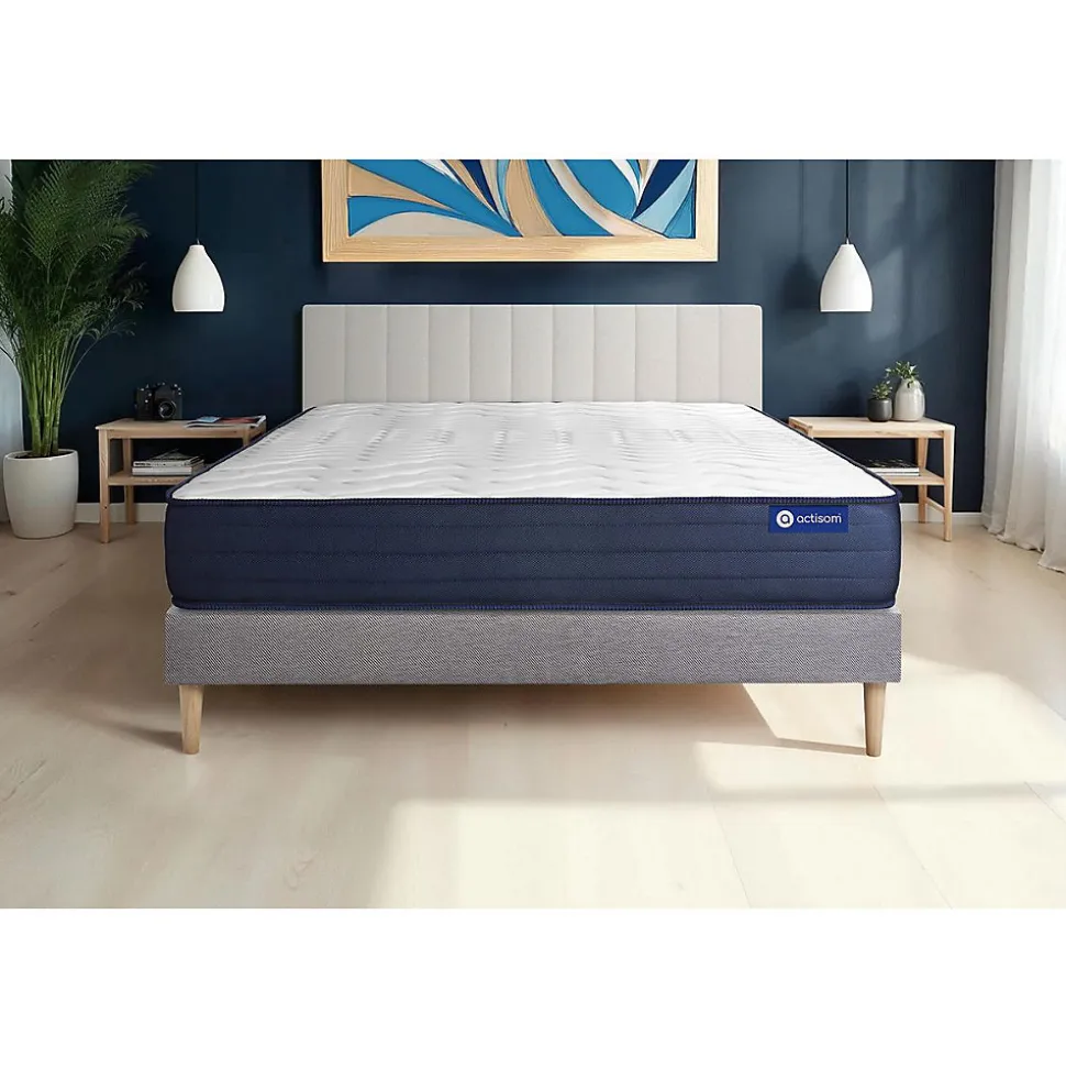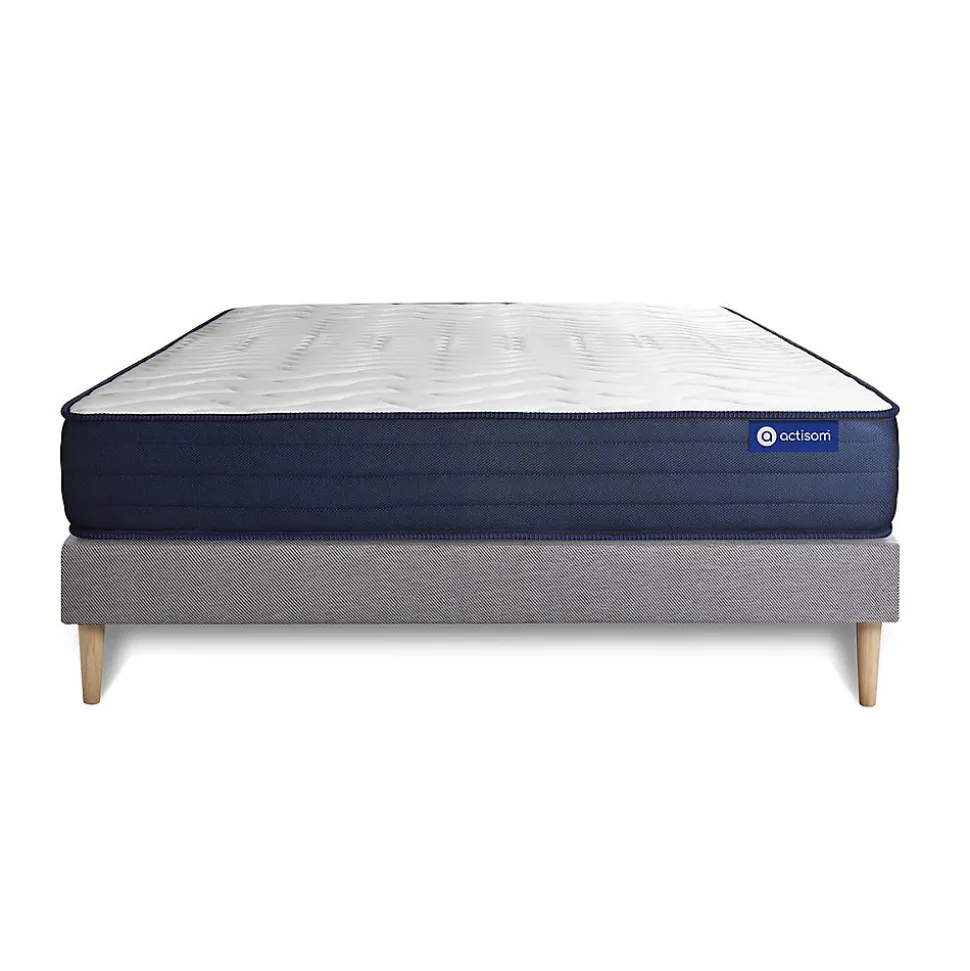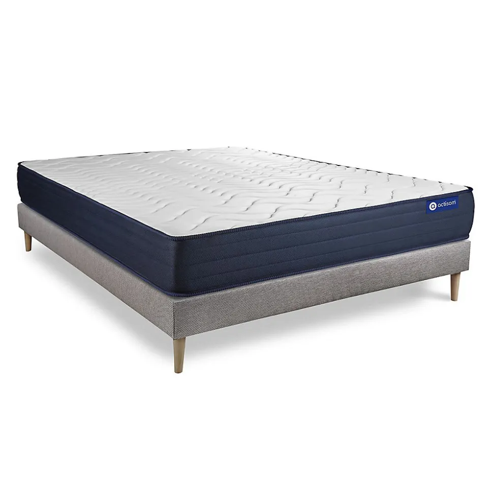 ACTISOM est une marque française développée en partenariat avec les plus grands experts européens du sommeil et de la literie. Après plusieurs années de recherche et de développement, nous avons mis au point des technologies innovantes (Actisoft – Actifresh – Acticell) afin de vous garantir d’excellentes nuits de sommeil. Tous nos matelas sont garantis 7ans et leur fabrication bénéficie d’un contrôle qualité très performant. Nos usines respectent les normes technologiques et environnementales européennes en vigueur.Le modèle Actiflex LIFE de la marque ACTISOM est doté d’un accueil en mousse à mémoire de forme et mousse Actisoft sur les deux faces. Vos points de pression sont allégés. Son ame en ressorts ensachés vous apporte un confort très ferme en soutien. Cette association de technologies permet de bénéficier d’une parfaite indépendance de couchage. Elle vous assure donc une totale liberté de mouvement.Epaisseur 22 cmPlateau pour les 2 faces 4cm Mousse polyuréthane à mémoire de forme + mousse polyuréthane actiSoftAme 961 ressorts ensachés ferme 15cmCoutil 100% polyester micro-perforé ultra respirableConfort Très FermeType de sommier : Tapissier à lattes démontable à assembler soi mêmeÉpaisseur : 14 cmStructure et traverses de renfort en pin massif2x15 lattes multiplisGarnissage fibres 100% polyester 120G/M2Tissu maille 100% polyester 260G/M2Pieds : Bois 15cm fournisMontage facile : le montage pourra être effectué par une personne seule en seulement 10 minutes Epaisseur 22 cmPlateau pour les 2 faces 4cm Mousse polyuréthane à mémoire de forme + mousse polyuréthane actiSoftAme 961 ressorts ensachés ferme 15cmCoutil 100% polyester micro-perforé ultra respirableConfort Très FermeType de sommier : Tapissier à lattes démontable à assembler soi mêmeÉpaisseu