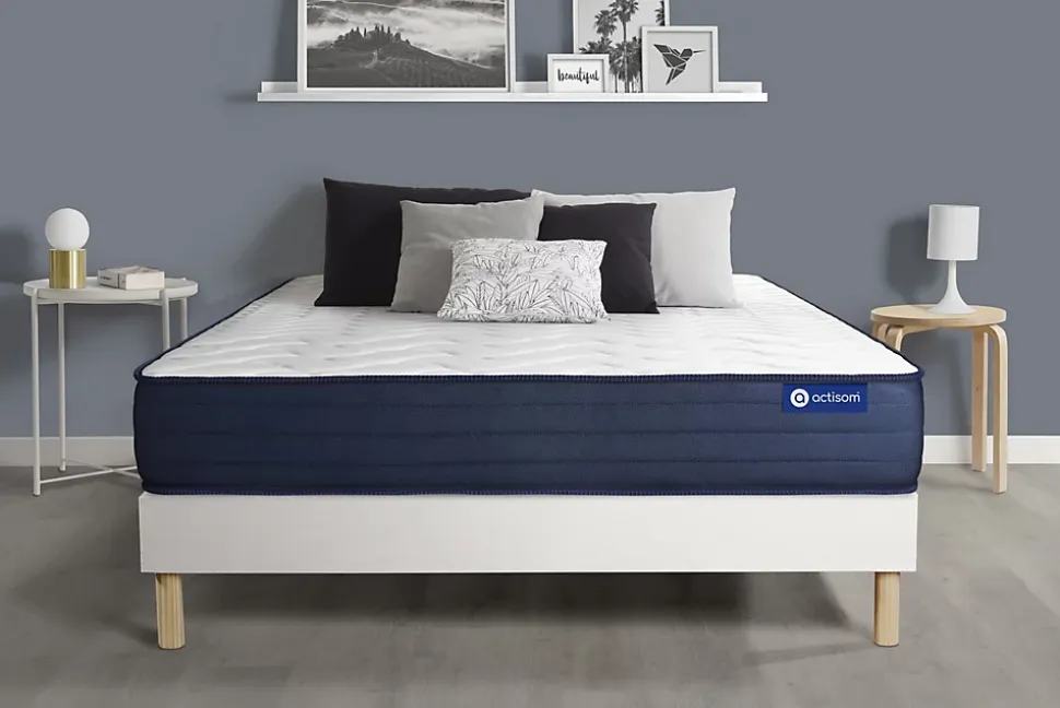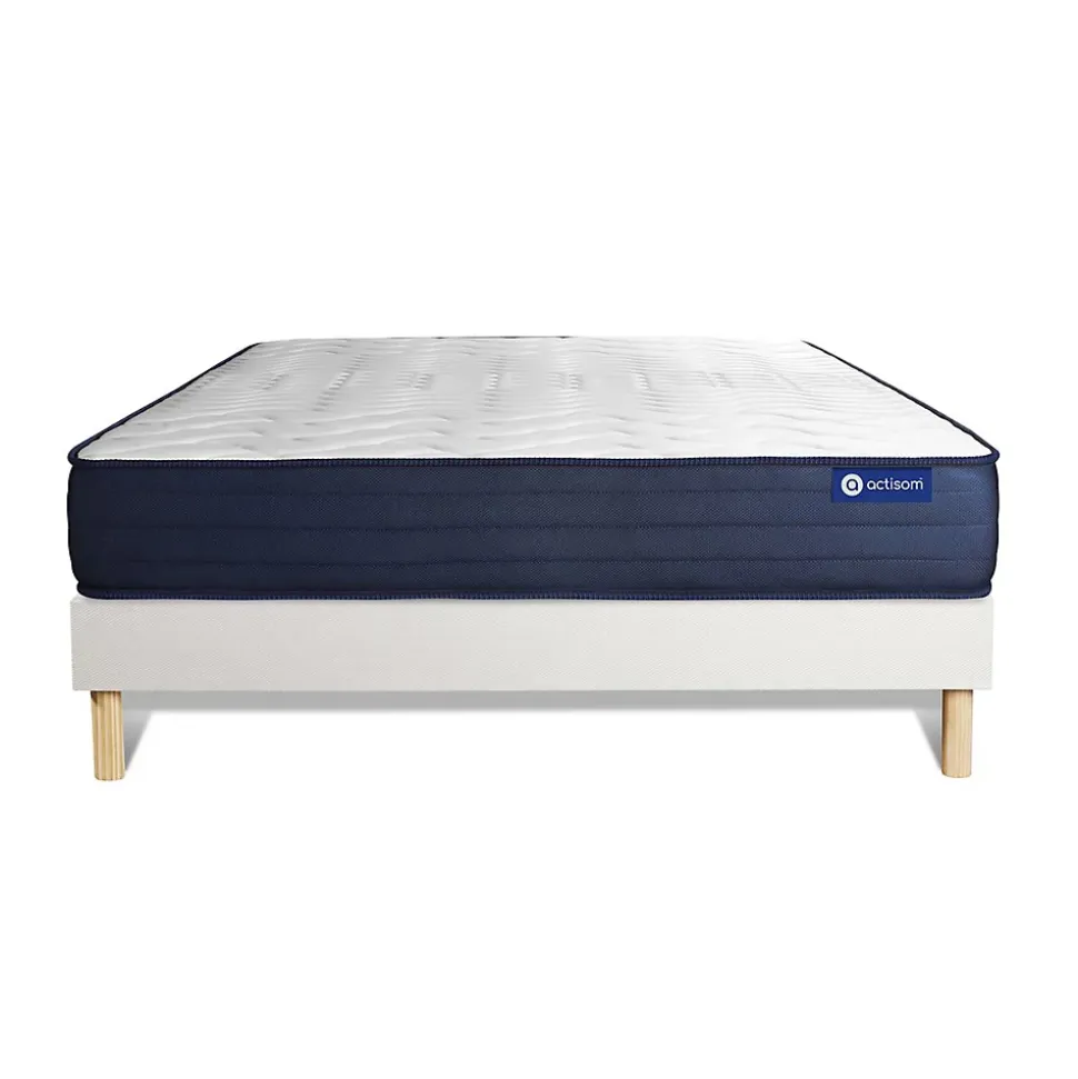 ACTISOM est une marque française développée en partenariat avec les plus grands experts européens du sommeil et de la literie. Après plusieurs années de recherche et de développement, nous avons mis au point des technologies innovantes (Actisoft – Actifresh – Acticell) afin de vous garantir d’excellentes nuits de sommeil. Tous nos matelas sont garantis 7ans et leur fabrication bénéficie d’un contrôle qualité très performant. Nos usines respectent les normes technologiques et environnementales européennes en vigueur.Le modèle Actiflex LIFE de la marque ACTISOM est doté d’un accueil en mousse à mémoire de forme et mousse Actisoft sur les deux faces. Vos points de pression sont allégés. Son ame en ressorts ensachés vous apporte un confort très ferme en soutien. Cette association de technologies permet de bénéficier d’une parfaite indépendance de couchage. Elle vous assure donc une totale liberté de mouvement.• Epaisseur 22 cm• Plateau pour les 2 faces 4cm Mousse polyuréthane à mémoire de forme + mousse polyuréthane actiSoft• Ame 744 ressorts ensachés ferme 15cm• Coutil 100% polyester micro-perforé ultra respirable• Confort Très Ferme• Type de sommier : Tapissier à lattes démontable à assembler soi même• Épaisseur : 14 cm• Structure et traverses de renfort en pin massif• 2×15 lattes multiplis• Garnissage fibres 100% polyester 120G/M2• Tissu maille 100% polyester 260G/M2• Pieds : Bois 15cm fournis• Montage facile : le montage pourra être effectué par une personne seule en seulement 10 minutes • Epaisseur 22 cm• Plateau pour les 2 faces 4cm Mousse polyuréthane à mémoire de forme + mousse polyuréthane actiSoft• Ame 744 ressorts ensachés ferme 15cm• Coutil 100% polyester micro-perforé ultra respirable• Confort Très Ferme• Type de sommier : Tapissier à lattes démontable à assembler soi même• Épaisseur : 14 cm• Structure et traverses de renfort en pin mass