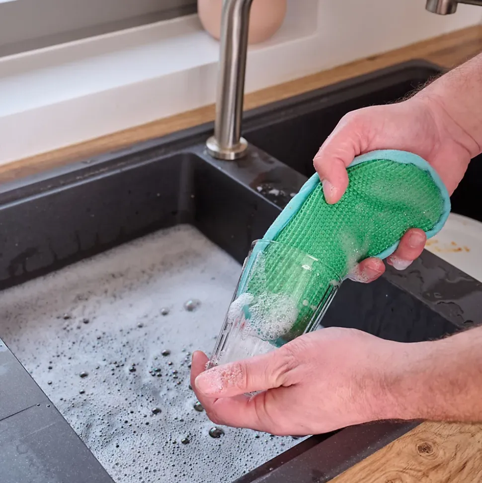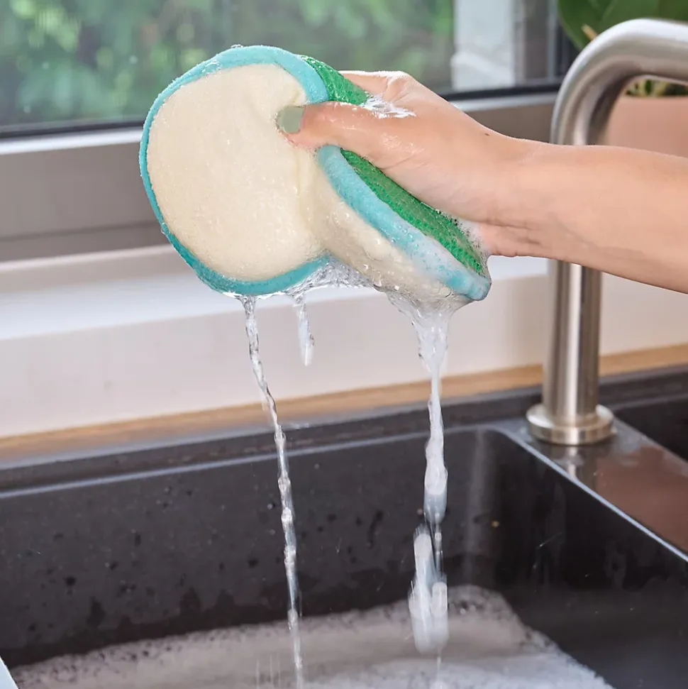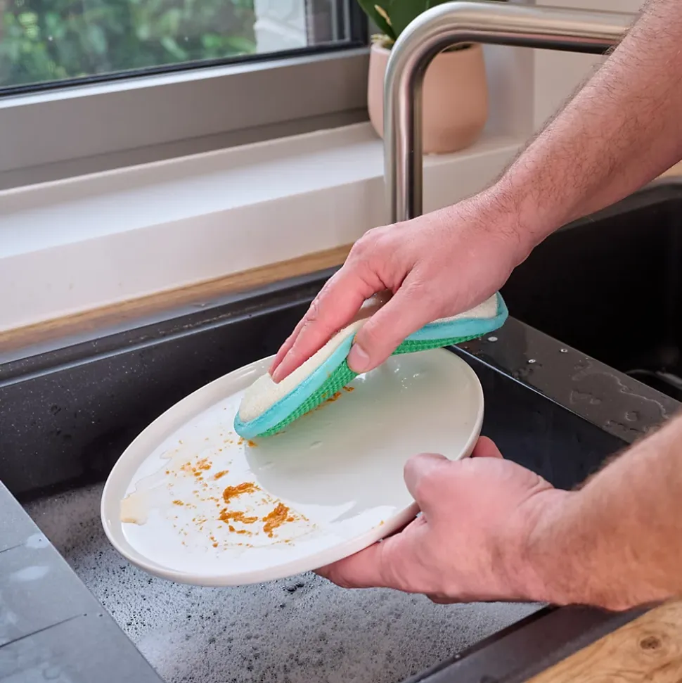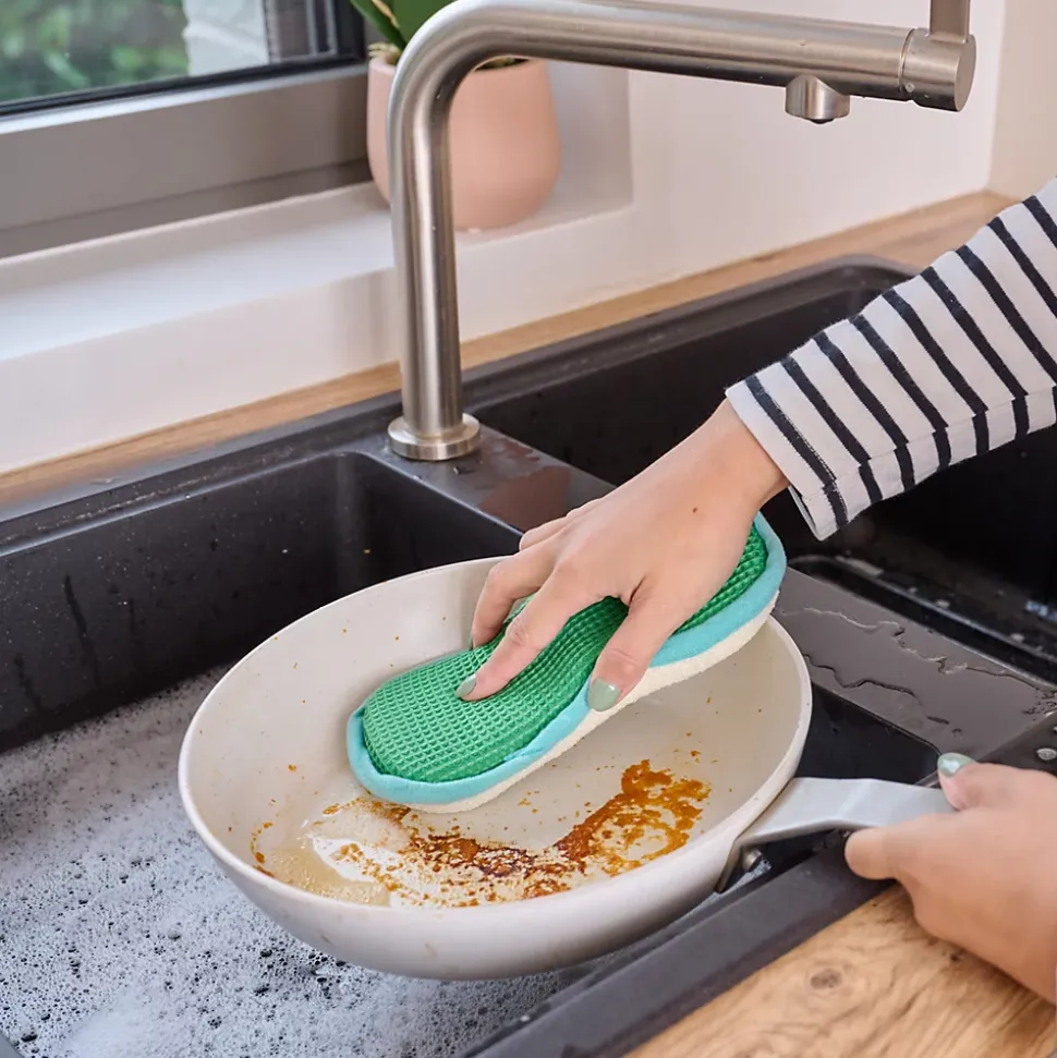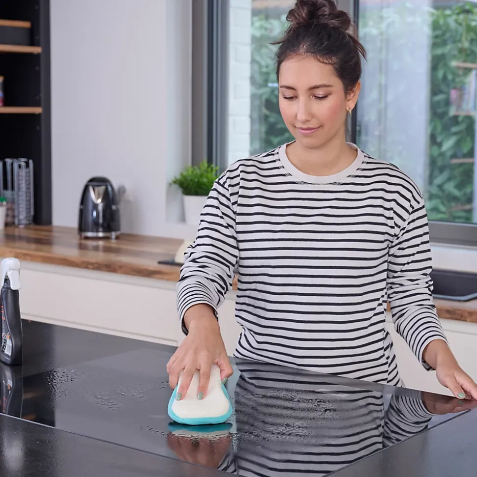 - L’éponge d’entretien est dotée de deux faces différentes, l’une texturée pour récurer et l’autre en microfibre pour capturer la poussière et éliminer la saleté
