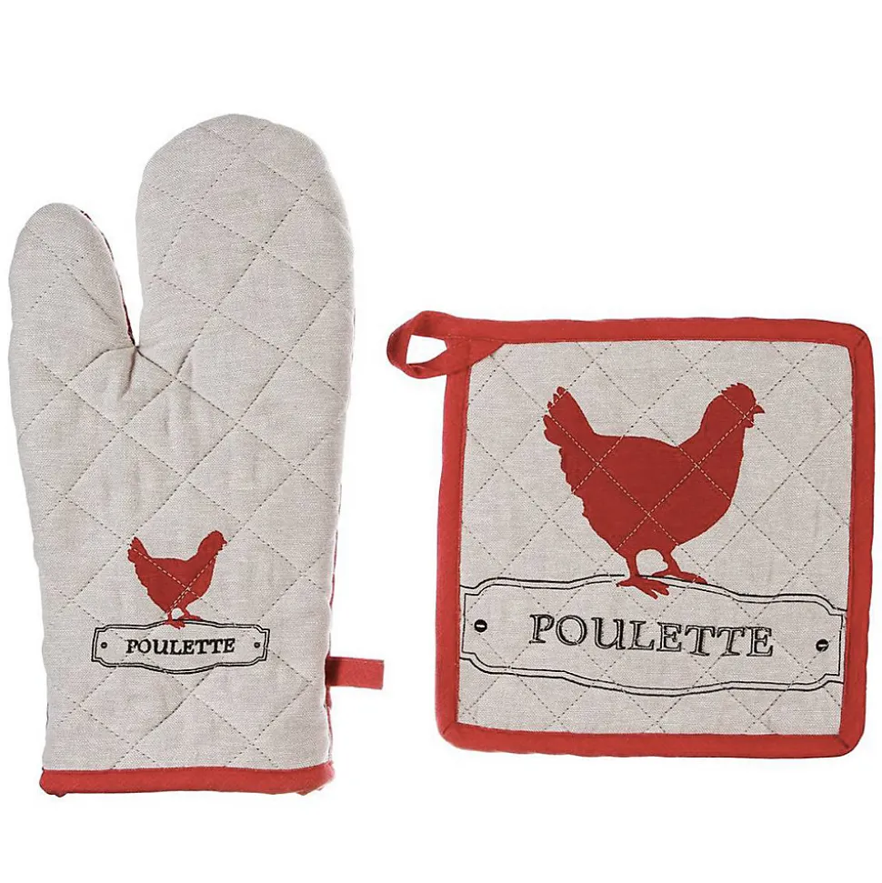 Offrez-vous le gant et manique « poule » Atmosphera ! Ludique et indispensable, il déposera une touche vintage dans une cuisine au style rétro.Un duo pratique et authentiqueCe gant et manique « poule » est composé d’un gant et d’une manique en pur coton. Réalisés dans un tissage brut et naturel, ils sont sobrement bordés d’un liseré de couleur et sont imprimés d’une poule colorée, perchée sur une petite plaque. Munis d’attaches permettant de les suspendre à des crochets, ils sont lavables en machine.Coordonnez votre gant et manique « poule » à un set de torchons Atmosphera issus de la même collection afin d’harmoniser votre déco avec une touche intemporelle.Le petit plus décoCollectionnez des poules déco que vous chinerez en brocante et placez-les sur une étagère afin de créer une ambiance chaleureuse.