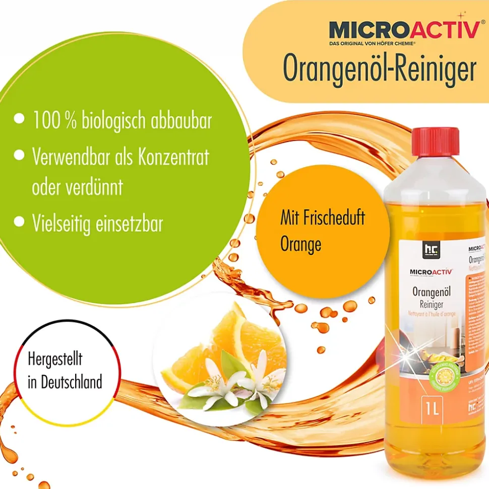 1 L Microactiv Nettoyant à l’huile d’orange concentréLe nettoyant à l’huile d’orange du monde du shopping en ligne de Höfer Chemie peut être utilisé de manière universelle dans toute la maison. Le nettoyant à l’huile d’orange concentré en bouteille de 1 litre est dilué dans de l’eau dans un rapport allant jusqu’à 1 : 1.000. L’excellent pouvoir dégraissant de ce nettoyant à l’huile d’orange hautement concentré est utilisé non dilué contre les salissures particulièrement tenaces.Voici l’effet du nettoyant à l’huile d’orange dans la pratiqueLe nettoyant à l’huile d’orange agit fortement contre les dépôts de graisse et diffuse pendant l’utilisation un agréable parfum de fruits du Sud mûrs. La dilution individuelle du nettoyant concentré à l’huile d’orange Microactiv avec de l’eau permet d’agir avec précision sur l’intensité d’une salissure. Lors du nettoyage des sols, les éclaboussures de graisse sont dissoutes de manière fiable, le nettoyant à l’huile d’orange de l’offre de Höfer Chemie prévient en même temps une nouvelle salissure par la graisse. L’effet de ce produit de nettoyage naturel au parfum d’orange peut être intensifié en ajoutant simplement de l’eau.Utilisation du nettoyant à l’huile d’orange : contre quelles salissures le concentré est-il efficace ?Le nettoyant ménager universel peut également être utilisé dans la voiture pour assurer un nettoyage en profondeur avec un air ambiant agréable. Le nettoyant à l’orange de la boutique Höfer Chemie est traditionnellement utilisé contre ces types de salissures :dissolution de graisses et d’huilesde nombreuses substances adhésives sont éliminées par le nettoyant à l’orange concentréLe nettoyant à l’huile d’orange Microactiv aide à décoller rapidement le chewing-gum, aussi bien des surfaces que des tissus.les taches de stylo à bille et autres taches tenaces peuvent être traitéesle concentré intensif disso…