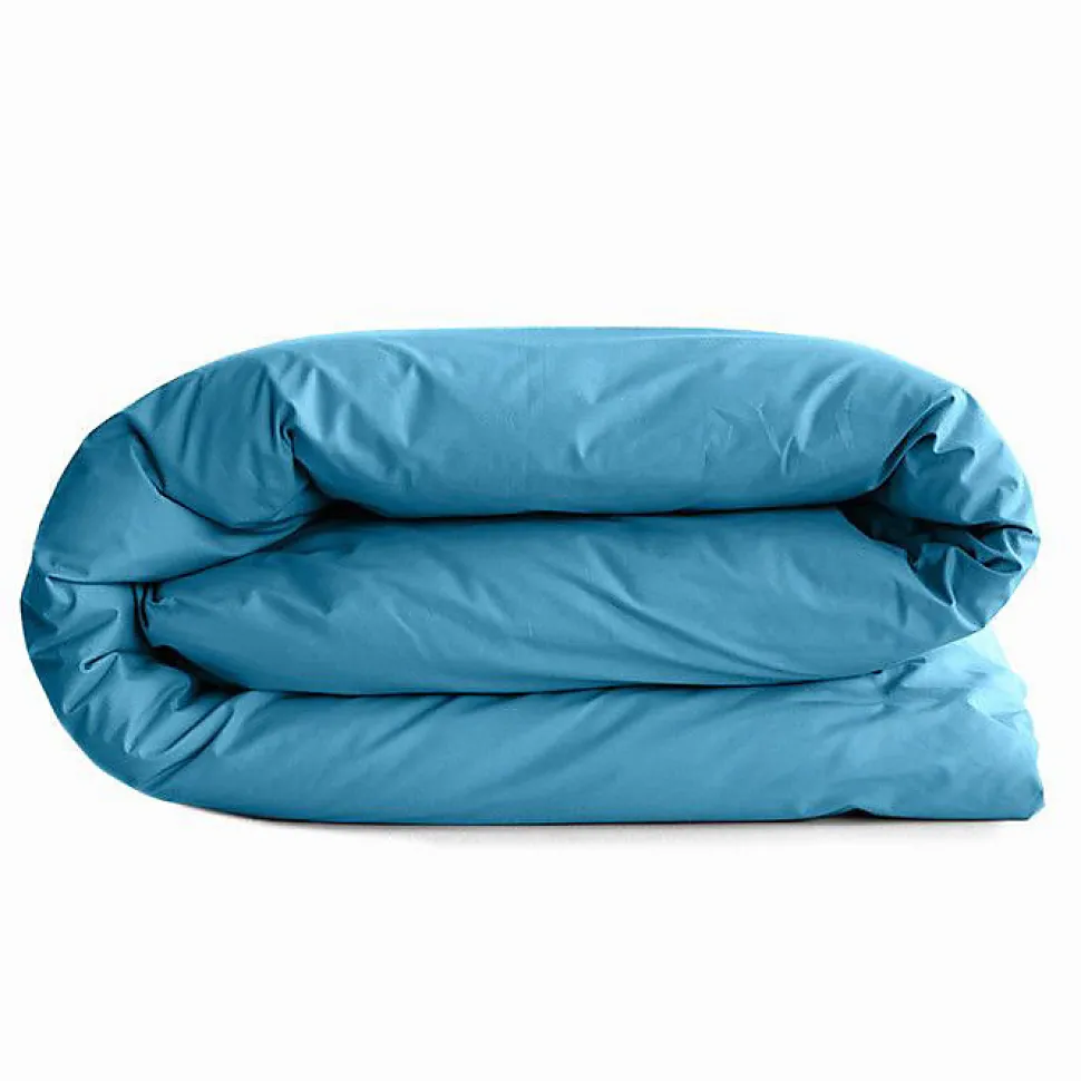 Housse de couette 140 x 200 cm en 100% coton 57 fils/cm², tissage très serré, couleur turquoise uni, gamme Prémium, certifiée Oeko-Tex, entretien machine 40°; confort respirant adapté aux quatre saisons.