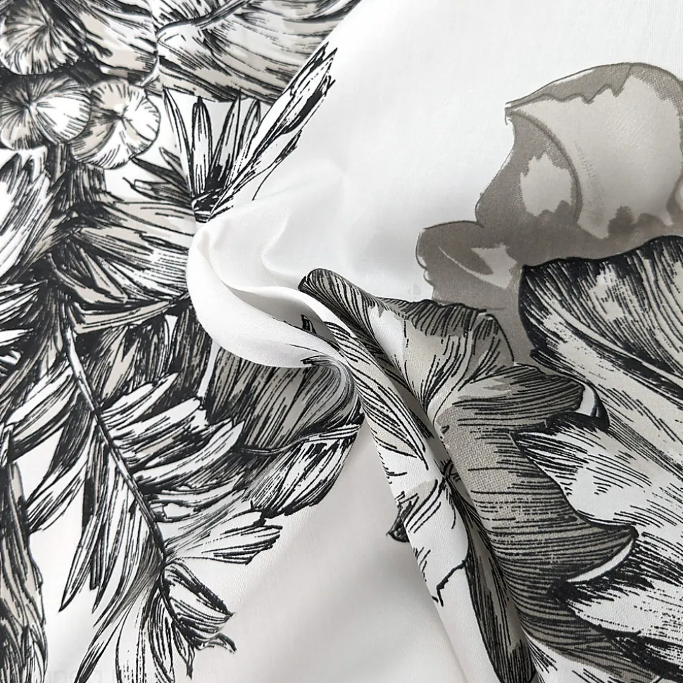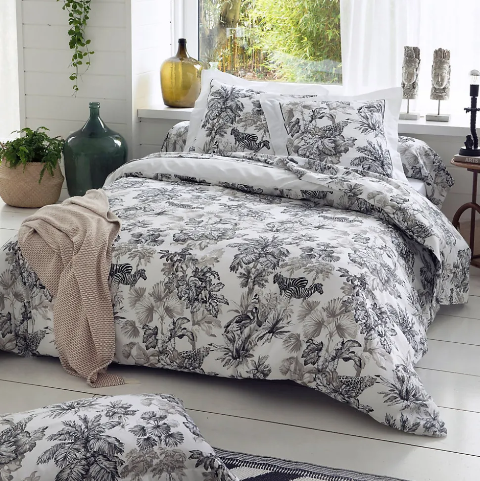 - Housse de couette 140×200 cm satin de coton 110 fils/cm² SAVANE blanc Parure de lit en satin de coton très qualitative et haut de gamme. Ambiance contemporaine avec cette végetation exotique et animaux (cachés) dans des tons de noir sur fond blanc.