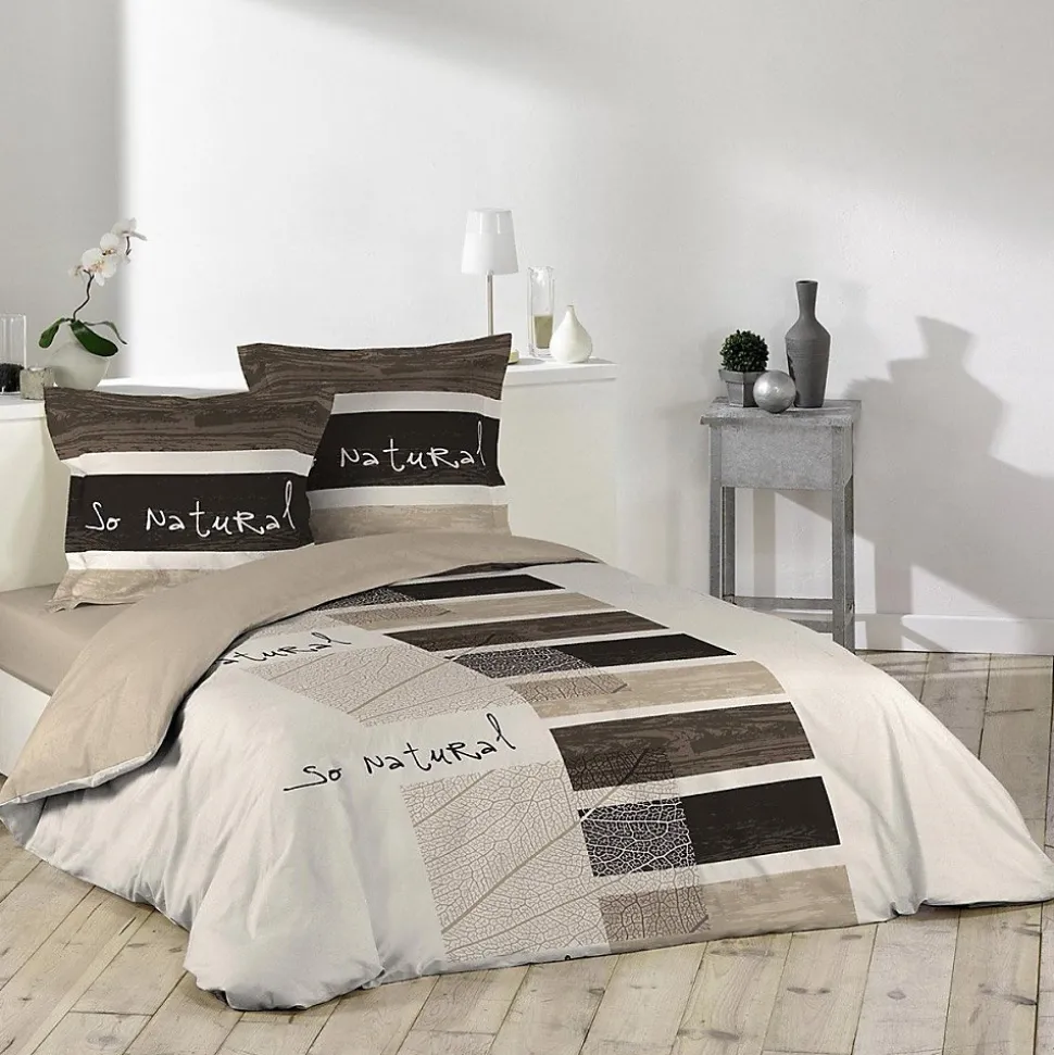 Housse de couette So natural en coton pour lit 1/2 personnesHabillez votre lit selon vos goûts grâce à cette superbe housse de couette So natural au motif graphique très réussi, fabriquée tout en coton doux au toucher.Créez une ambiance relaxante et douce dans votre chambre grâce à la parure de couette So natural pour lit 1/2 personnes. Cette parure de couette imprimée So natural coton 3 pièces est composée de :1 housse de couette 200×200 cm finition pressions2 taies d’oreiller 63×63 cm à volant platCette housse de couette est constituée à 100% coton au tissage serré 42 fils/cm².