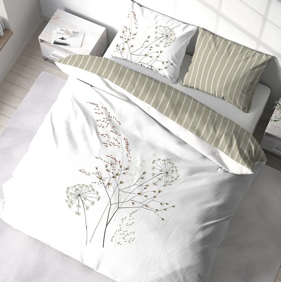 Habillez votre lit grâce à cette très belle housse de couette SOLIFLORE au motif réversible qui vous permettra de changer de décoration tout en gardant la même housse de couette.Fabriquée en coton au tissage serré 57fils/cm2 ; c’est une matière naturelle gage de confort et de douceur.Cette parure de couette imprimée SOLIFLORE 3 pièces est composée de :1 housse de couette 240×220 cm réversible avec fermeture boutons et fente passe-mains;2 taies d’oreiller 63×63 cmCette ensemble de linge de lit est constituée de fibres 100% coton au tissage serré 57fils/cm2.Standard OEKO-TEX- Made in green ; Label de confiance qui garantit l’absence de substances nocives et une fabrication par des entreprises responsables.