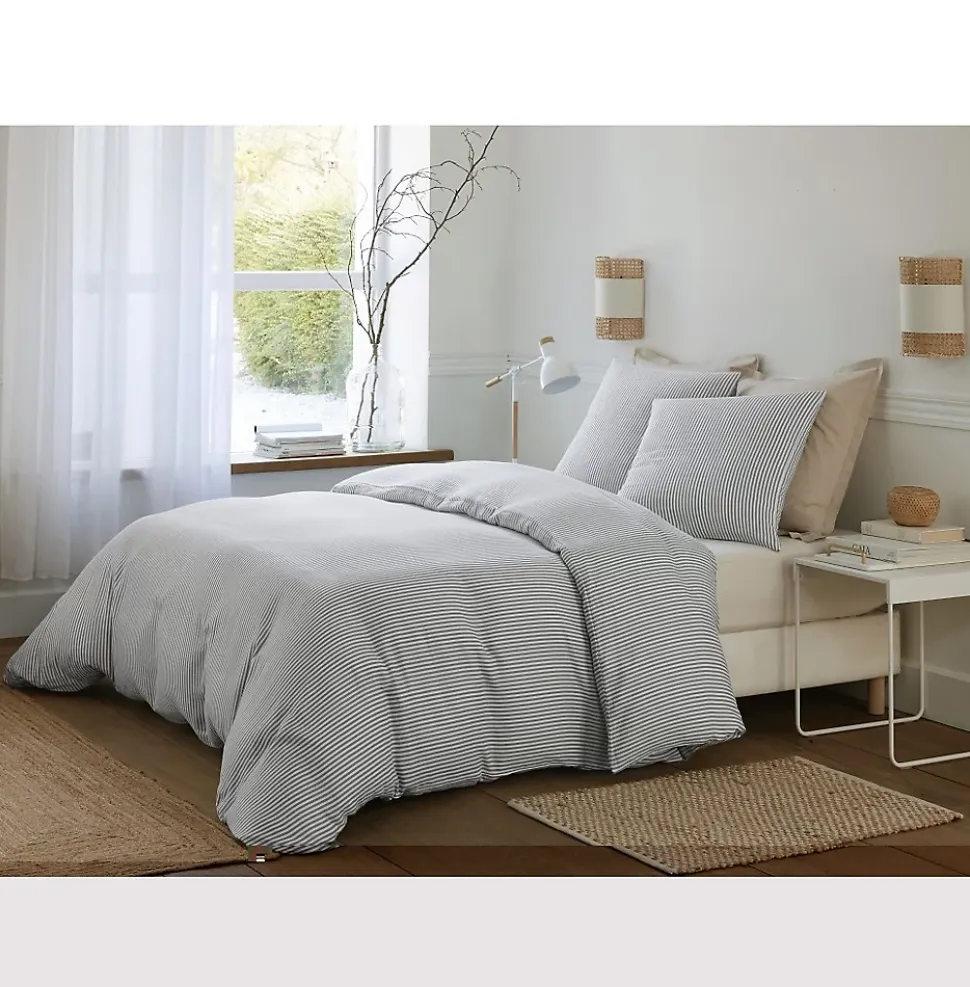 Apportez une touche de douceur et de modernité à votre chambre avec cette parure housse de couette 3 pièces Imprimé Soleïs en 100% gaze de coton. Son motif rayé sobre et sa couleur gris perle illuminent votre espace tout en créant une ambiance apaisante et élégante. ✔️ Couleur : gris perle✔️ Taille : 240×260 cm (parfaite pour lits king size ou grands lits)✔️ Contenu : 1 housse de couette + 2 taies d’oreiller assorties✔️ Matière : 100% gaze de coton – ultra douce, légère et respirante✔️ Finition : boutonnière dissimulée pour un rendu élégant et minimaliste✔️ Certification : Oeko-Tex, sans pour la santé✔️ Conseils d’entretien : lavage en machine à 30°, ne pas blanchir, ne pas sécher en machine, ne pas nettoyer à sec ✨ Pourquoi choisir cette parure Soleïs ? Confort naturel et respirant Look moderne e…