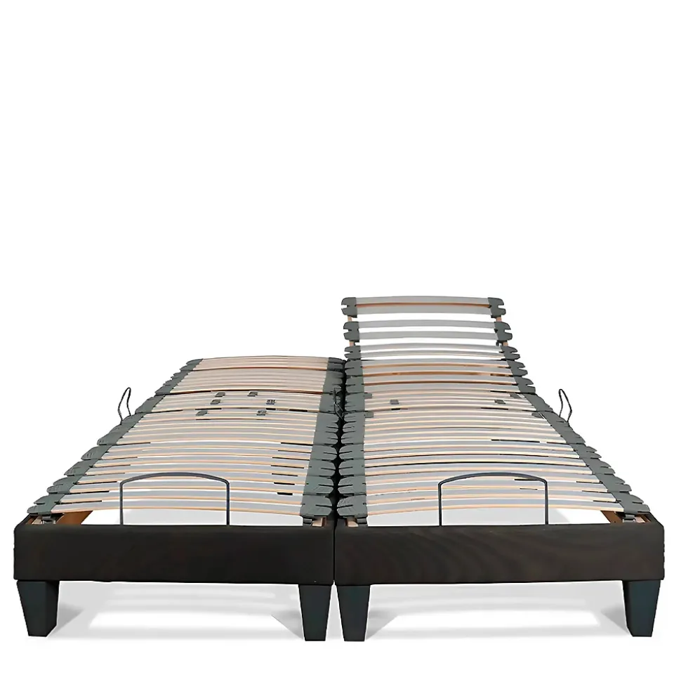 CARACTERISTIQUES :Type de sommier : Sommmier électriqueType de suspension : LattesTechnologie : Bi-lattesDimensions disponibles (cm) : 2x70x190 – 2x70x200 – 2x80x190 – 2x80x200 – 2x90x190 – 2x90x200Hauteur du sommier (pieds montés) : 30 cmEpaisseur du cadre : 14 cmHauteur des pieds : 16 cmNombre de pieds : 2x4Nombre de lattes : 2x31Dimensions des lattes : 36 mm de largeur – 8 mm d’épaisseurFonctionnement : Avec télécommande filaireFabrication : BelgiqueConditionnement : A plat (livré monté)Garantie : Structure 5 ans – Moteur 2 ansCOMPOSITION :Cadre : Bois d’épicéa + hêtre recouvert de tissu d’ameublement gris de 334 gr/m²Lattes : Placage de bouleau avec revêtement film grisEmbouts : Polyéthylène gris bi-lattesPieds (inclus) : Polypropylène thermoformé grisPOINTS FORTS :Confort sur-mesure : Fonction relevage tête, buste et/ou jambes + Renforts lombaires avec curseurs de fermeté.Robustesse : Composants de haute qualité (bois, ferrures métalliques, moteur allemand…).Autonomie : Fonction relais en cas de coupure de courant (pile de 9V).Sécurité : Butées d’arrêt matelas.Hygiène : Favorise l’aération du matelas.Finitions soignées : Tissu qui s’accorde avec tous types d’intérieurs et pieds assortis au sommier.Intégrable dans un cadre de lit.