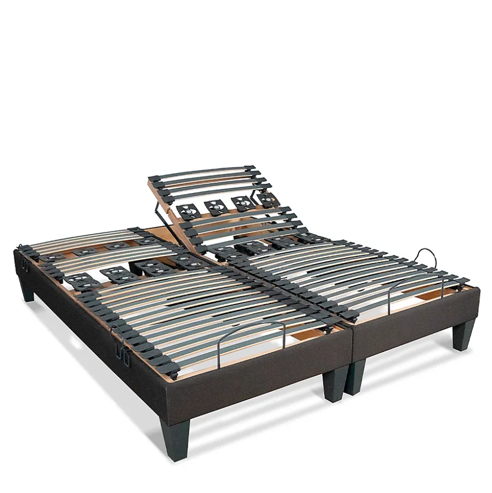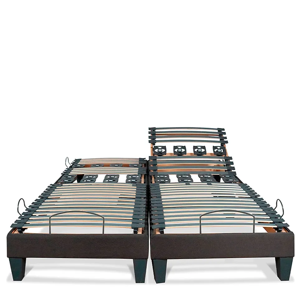CARACTERISTIQUES :Type de sommier : ElectriqueSuspension : Lattes + PlotsDimensions disponibles (cm) : 2x70x190 – 2x70x200 – 2x80x190 – 2x80x200 – 2x90x190 – 2x90x200Hauteur du sommier (avec pieds) : 30 cmEpaisseur du cadre : 14 cmHauteur des pieds : 16 cmNombre de pieds : 2x4Nombre de plots : 2x12Nombre de lattes : 2x23Dimensions des lattes : 36 mm de largeur – 8 mm d’épaisseurFonctionnement : Avec télécommande filaireFabrication : BelgiqueGarantie : Structure 5 ans – Moteur 2 ansLivré à plat (monté)COMPOSITION :Cadre : Bois d’épicéa + hêtre recouvert de tissu grisLattes : Placage de bouleau avec film grisPlots : Polypropylène + Copolyester thermoplastique + Acrylonitrile butadiène styrène grisEmbouts : Polyéthylène grisPieds (inclus) : Polypropylène thermoformé grisPOINTS FORTS :Confort sur-mesure : Fonction relevage tête, buste et/ou jambes + Renforts lombaires et plots avec curseurs de fermeté.Robustesse : Composants de haute qualité (bois, plots en élastomère, ferrures métalliques, moteur allemand…).Autonomie : Fonction relais en cas de coupure de courant (pile).Sécurité : Butées d’arrêt matelas.Hygiène : Favorise l’aération du matelas.Finitions soignées : S’accorde avec tous types d’intérieurs.Intégrable dans un cadre de lit.