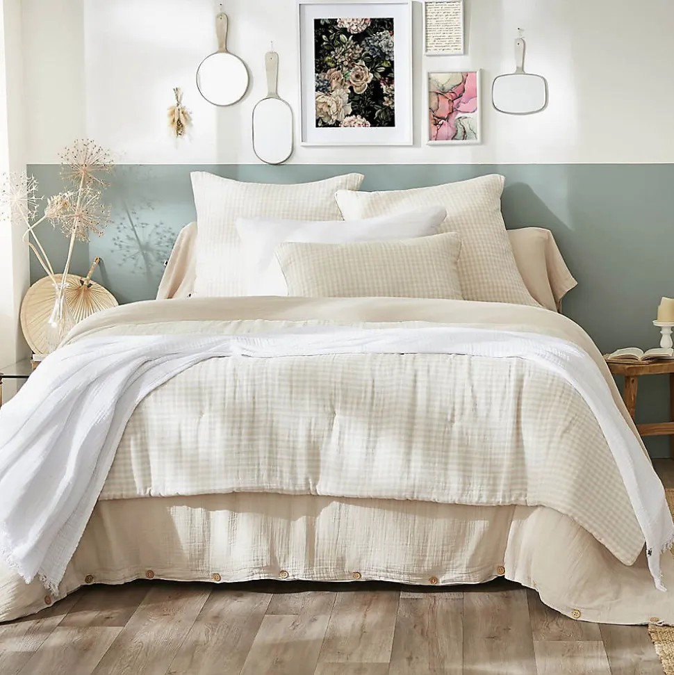 - Chemin de Lit 90x200cm Gaze de Coton Vichy Coloris Pampa de la gamme Joel. Un imprimé vintege et intemporel, en gaze de coton, légère, fluide et confortable.
