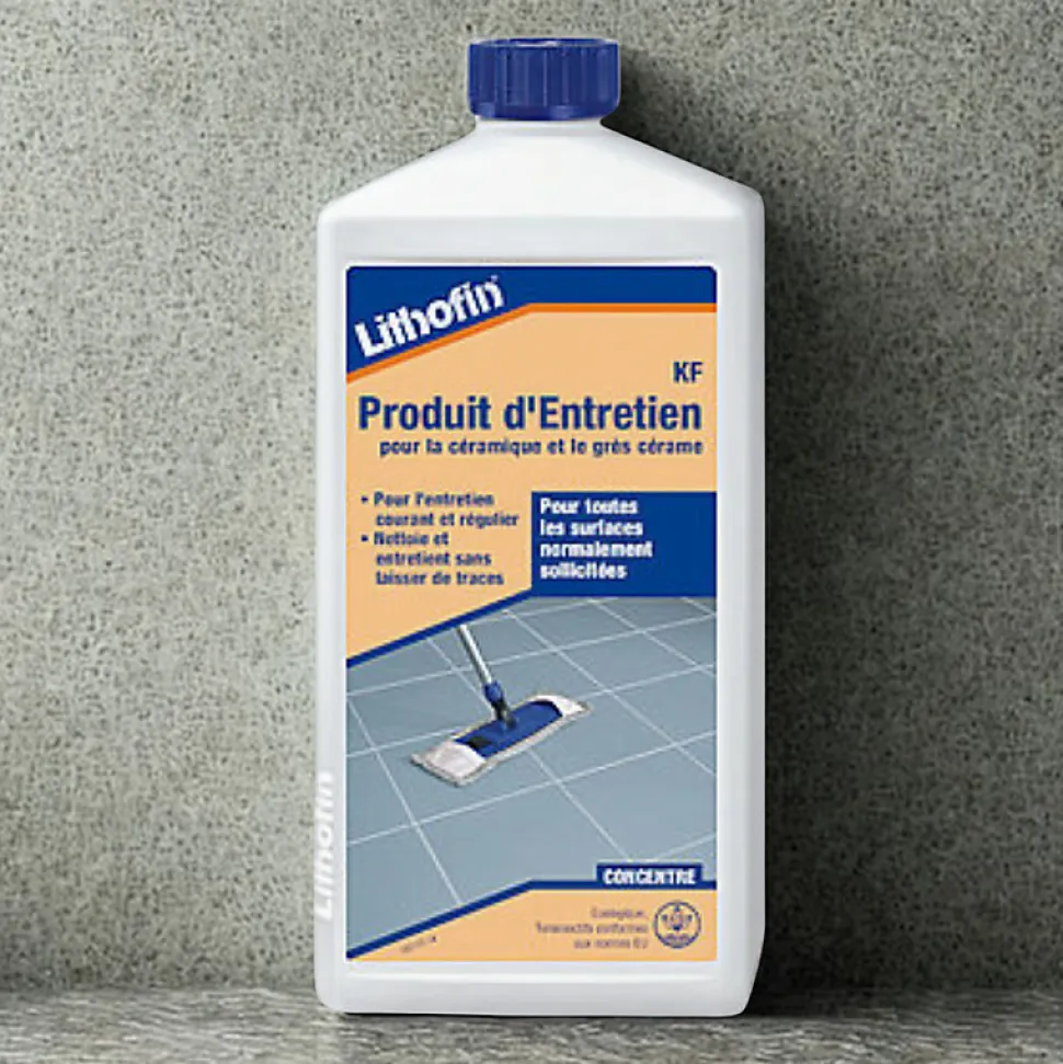 KF Produit d’entretien – Entretien régulier des sols à sollicitation normale – LithofinLithofin KF Produit d’entretien est un concentré faiblement alcalin et sans solvant.Il contient un mélange équilibré d’agents nettoyants spéciaux dissolvant la graisse et les salissures et d’additifs d’entretien.Il dissout et élimine les salissures en tout genre, les fines couches d’huile et de graisse et les déchets dus au frottement du caoutchouc et des chaussures.Une fois nettoyée, la surface reste propre et sans trace et, avec une utilisation régulière, s’embellit et devient plus résistante.Il ne forme pas de pellicule.Spécifications techniques :Densité : env. 1,0 g/cm3pH : env. 11 (concentré)Aspect : liquide limpide et bleuOdeur : légèrement citronnéeSolubilité dans l’eau : très bienDomaine d’application :On utilisera Lithofin KF Produit d’entretien pour l’entretien courant de tous les carreaux de grés cérame polis ou non émaillés. Convient aussi très bien au nettoyage d’autres surfaces en céramique.Mode d’emploi :Lithofin KF Produit d’entretien sera toujours ajouté à l’eau de lavage. Une pression (20-40 ml dans 8 litres d’eau) suffit.Passer sur le revêtement à l’aide d’un chiffon ou d’un balai-éponge humide.Ne pas marcher sur le sol encore humide.Lithofin KF Produit d’entretien peut aussi être utilisé dans les machines de nettoyage. Dosage : 20ml environ pour 10 litres d’eau.Pour les surfaces très encrassées, nous conseillons Lithofin KF Nettoyant intensif pour un nettoyage occasionnel.<