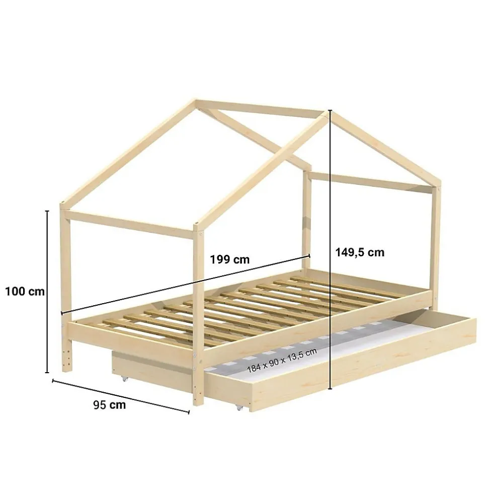 KOALA Lit cabane enfant avec tiroir – Bois Epicéa massif – Coloris : Naturel – Couchage : 90x190cm – Sommier 12 lattes inlcus – Vendu sans matelas – Dimensions totales : L199 x l95 x H149,5 cm