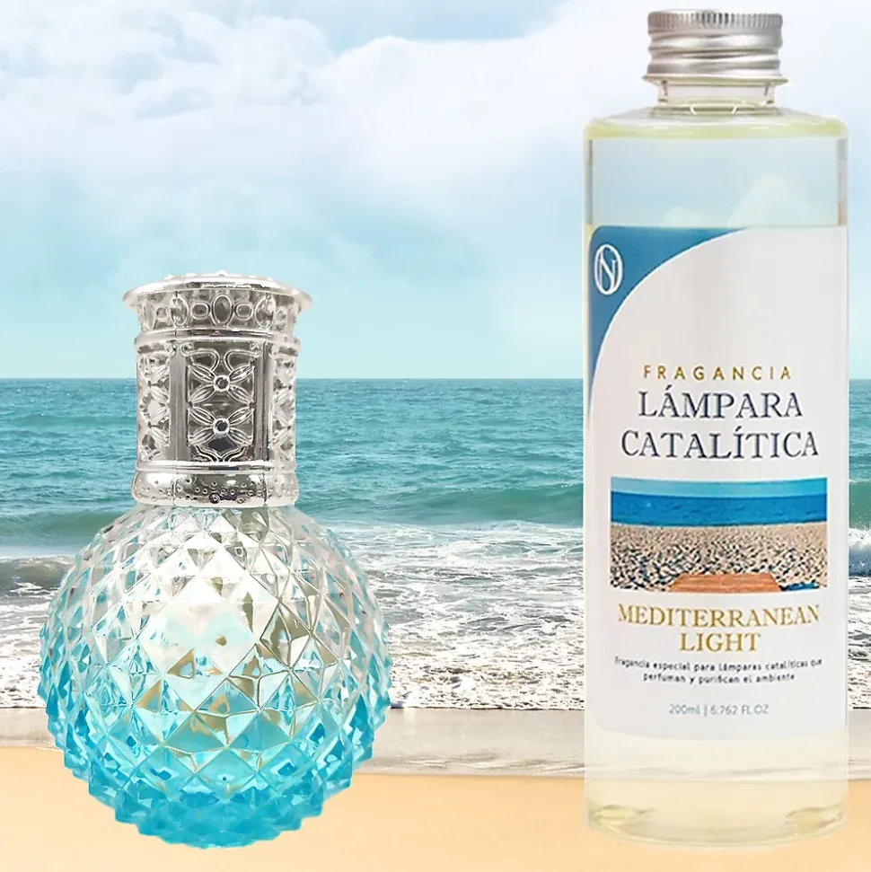 ❗ Pack Économique Lampe Catalytique Blue Diamonds + Parfum Mediterranean Light 500 ml ❗Une lampe catalytique parfume et purifie l’air et élimine les odeurs tenaces telles que le tabac, les odeurs de cuisine, l’humidité, les animaux domestiques… Le système de désodorisant à lampe catalytique crée non seulement une ambiance parfumée, mais améliore également la qualité de l’air et embellit la pièce d’un design élégant. En seulement 20 à 30 minutes d’utilisation, la pièce sera parfumée pendant 2 heures. Lorsqu’elle est allumée, la pierre chauffe et génère une catalyse, qui décompose les particules odorantes et purifie l’environnement.⁉️ Comment utiliser une lampe catalytique ?1. REMPLIR LA LAMPE DE PARFUM : Retirez le bouchon décoratif et le capuchon et remplissez la lampe aux 3/4 avec le parfum choisi.2. PLACER LA MÈCHE DANS LA LAMPE : Insérez la mèche éteinte dans la lampe et laissez-la imprégner de parfum pendant environ 15 minutes.3. ALLUMER LA MÈCHE : À l’aide d’un briquet ou d’allumettes, allumez la mèche et laissez la flamme allumée pendant 2 minutes, jusqu’à ce qu’elle se réduise.4. ÉTEINDRE LE BRÛLEUR EN SOUFFLANT : Une fois la flamme réduite, soufflez pour l’éteindre complètement et remettez le capuchon décoratif.5. FIXER LA TÊTE DÉCORATIVE : Une fois la flamme éteinte, placez la tête décorative (avec les trous) sur la lampe à catalyse pour diffuser le parfum. Il est recommandé de l’utiliser pendant 20 à 30 minutes.6. ÉTEINDRE LA LAMPE CATALYTIQUE : Pour éteindre complètement la lampe catalytique, retirez le capuchon décoratif et remettez le capuchon métallique fermé, ce qui arrête la combustion.