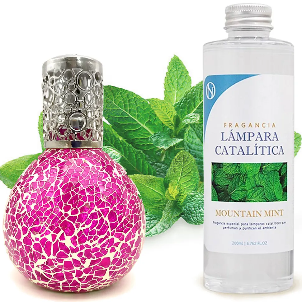 ❗ Pack Économique Lampe Catalytique Mosaïque Fuchsia + Parfum Mountain Mint 500 ml ❗Une lampe catalytique parfume et purifie l’air et élimine les odeurs tenaces telles que le tabac, les odeurs de cuisine, l’humidité, les animaux domestiques… Le système de désodorisant à lampe catalytique crée non seulement une ambiance parfumée, mais améliore également la qualité de l’air et embellit la pièce d’un design élégant. En seulement 20 à 30 minutes d’utilisation, la pièce sera parfumée pendant 2 heures. Lorsqu’elle est allumée, la pierre chauffe et génère une catalyse, qui décompose les particules odorantes et purifie l’environnement.⁉️ Comment utiliser une lampe catalytique ?1. REMPLIR LA LAMPE DE PARFUM : Retirez le bouchon décoratif et le capuchon et remplissez la lampe aux 3/4 avec le parfum choisi.2. PLACER LA MÈCHE DANS LA LAMPE : Insérez la mèche éteinte dans la lampe et laissez-la imprégner de parfum pendant environ 15 minutes.3. ALLUMER LA MÈCHE : À l’aide d’un briquet ou d’allumettes, allumez la mèche et laissez la flamme allumée pendant 2 minutes, jusqu’à ce qu’elle se réduise.4. ÉTEINDRE LE BRÛLEUR EN SOUFFLANT : Une fois la flamme réduite, soufflez pour l’éteindre complètement et remettez le capuchon décoratif.5. FIXER LA TÊTE DÉCORATIVE : Une fois la flamme éteinte, placez la tête décorative (avec les trous) sur la lampe à catalyse pour diffuser le parfum. Il est recommandé de l’utiliser pendant 20 à 30 minutes.6. ÉTEINDRE LA LAMPE CATALYTIQUE : Pour éteindre complètement la lampe catalytique, retirez le capuchon décoratif et remettez le capuchon métallique fermé, ce qui arrête la combustion.