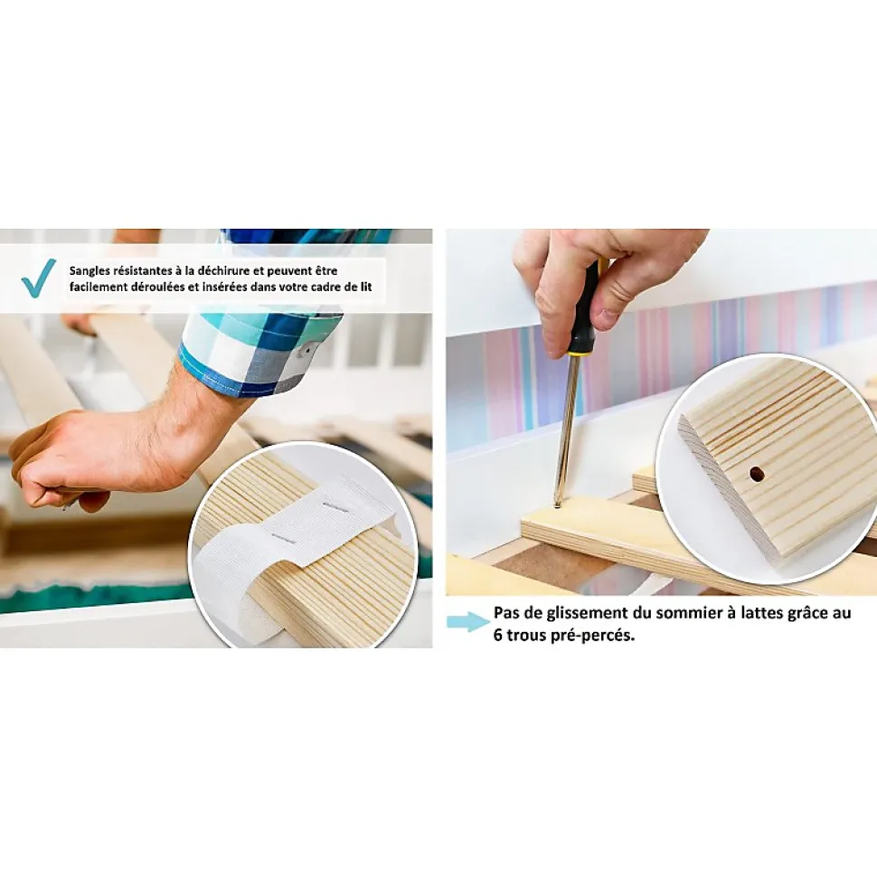 « Lattes sans cadre 140x200cm 14 lattes en bois massif pour soutien ferme avec sangle enroulé Le sommier à lattes de haute qualité est fabriqué à partir de bois massif non traité de première qualité provenant de forêts gérées durablement en Europe.Les lattes pour adultes et enfants se composent de lattes de 2 cm d’épaisseur avec des trous de montage pré-percés. Les lattes sont reliées par des sangles de transport résistantes à la déchirure.Avec le cadre de lit, vous créez une base de matelas stable. Cela convient à tous les matelas (noyau à ressorts, mousse froide) et à tous les lits (lit bébé, lit senior, lit familial).Le cadre enroulable de haute qualité (entièrement assemblé) pour un sommeil parfait. Déroulez simplement le sommier à lattes sur le sommier.Grâce aux 6 trous pré-percés, les sommiers à lattes premium peuvent être fixés avec des vis en tête, au milieu et au pied. Cela signifie que les sommiers à lattes ne peuvent pas glisser et que vous pouvez vous détendre et profiter de votre sommeil. Avantages :- Fabriqué à partir de bois massif – Convient à tous les types de matelas- Assure une bonne circulation de l’air dans le matelas- Avec 14 lattes de bois- 140cm de largeur- Trous de montage pré-percés- Fabriqué en EuropeVous trouverez sur notre boutique différentes tailles.Support client et SAV en Français – Pas de livraison dans le DOM TOM, Monaco et la Corse.(Dont éco-participation 2,50€) »