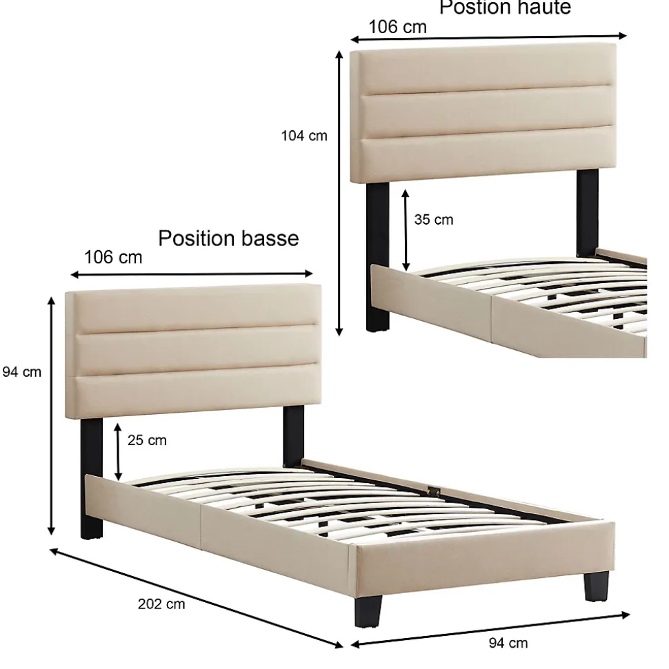 Le lit simple Florida … avec sa tête de lit capitonnée moelleuse, invite à passer une bonne nuit de sommeil. Son revêtement moderne en tissu beige s’accordera facilement avec le reste des meubles de votre chambre. Ce lit 1 place pour enfant comme adulte, est particulièrement confortable. Vous pouvez régler la hauteur de la tête de lit au montage selon 3 positions, ainsi vous pouvez ajuster ce lit selon votre taille ou la taille de votre matelas. Le sommier est inclus. Description des matériaux : – La structure du lit est recouverte d’un revêtement en tissu capitonné, de coloris noir. – Les pieds du lit sont en plastique de coloris noir. – Les lattes du sommier sont en contreplaqué. Caractéristiques du produit : – Lit simple 90 x 190 cm – Hauteur pieds de lit: 25 cm – Hauteur (position basse) : 94 cm – Hauteur (position moyenne) : 100 cm – Hauteur (position haute) : 104 cm – Sommier à lattes inclus – Matelas non inclus Livraison et montage : – Contenu de la livraison : lit, sommier, notice de montage – Le produit est livré en pièces détachées – Assemblage facile grâce à la notice – Livré sans matelas et sans décoration – Photo non contractuelle Résumé: – Hauteur tête de lit: 104 cm – Profondeur d’insertion: 4 cm – Convient uniquement avec: Sommier fagot à lattes – Description du matériel: 100% Polyester – Extras: Avec sommier à lattes – Traverse avec pied d’appui: Oui – Dimensions monté: 104 x 202 x 106 cm (H x L x L) – Couchage: 90 x 190 cm – Couleur: Beige – Matériel: Tissu de recouvrement