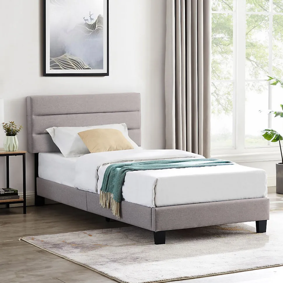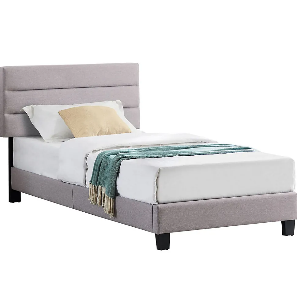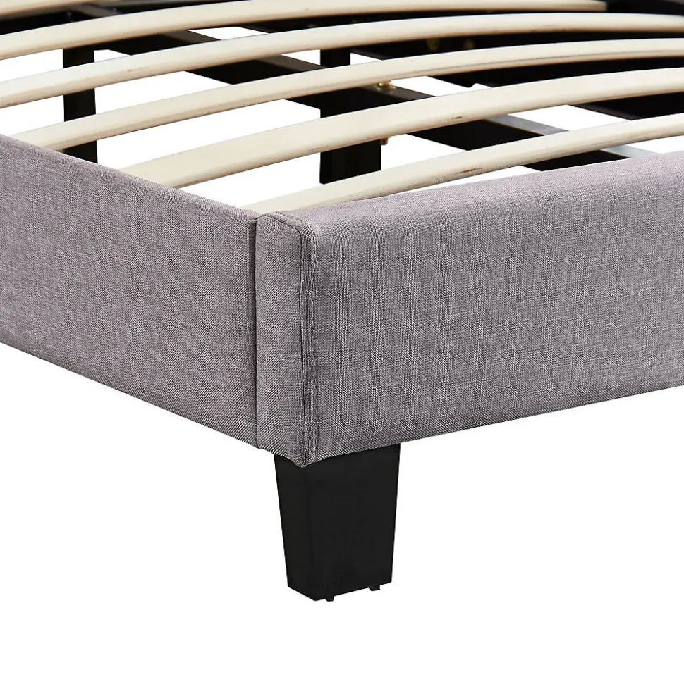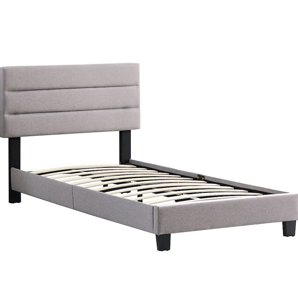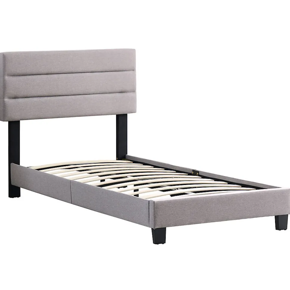 - La structure du lit est recouverte dun revêtement en tissu capitonné, de coloris gris